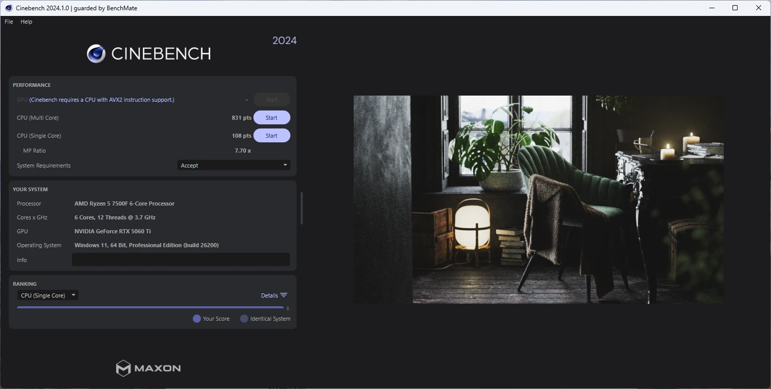 Zugegeben, unser Testsystem basiert nur auf einem vergleichsweise schwachem AMD Ryzen 5 7500F, aus diesem holt das Board allerdings auch alles raus. Im Cinebench 2024 erzielen wir 831 Punkte im Multi und 108 Punkte um Singlebench Score. Dies deckt sich mit werten anderer Benchmarks mit der CPU.