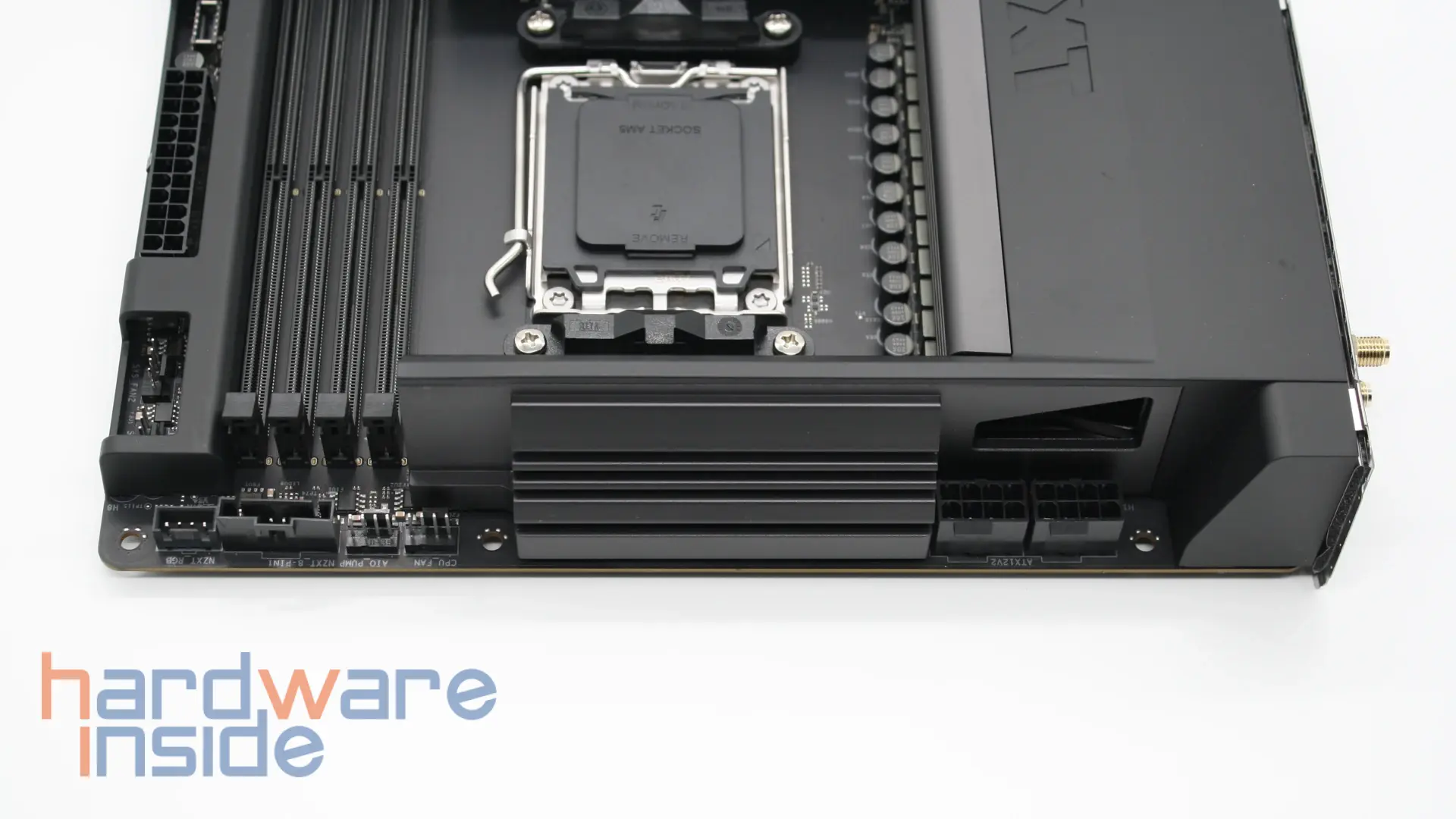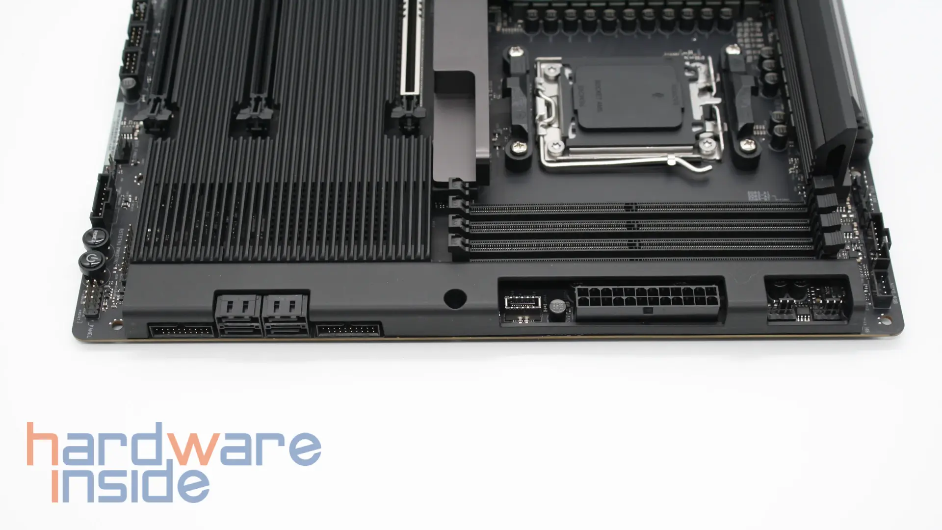 Neben dem AM5-Sockel, der bereits mit einem Standardsockel für AM5-CPU-Lüfter ausgestattet ist, befinden sich vier Steckplätze für DDR5-DIMM-Riegel. Nativ werden DDR5-5200 (Ryzen 7000/Ryzen 8000G) und DDR5-5600 (Ryzen 9000) unterstützt. Laut Herstellerangaben sind Übertaktungsraten bis DDR5-8000 möglich. Bei den DIMM-Steckplätzen handelt es sich um das übliche Dual-Channel-Design für UDIMM-Non-ECC-Riegel. Maximal werden 256 GB unterstützt.