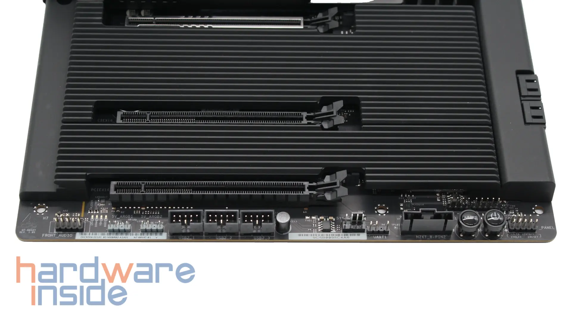 An der Unterseite des Mainboards befinden sich Anschlüsse für das Frontpanel, Front-Audio, drei USB-2.0-Header (jeweils zwei Ports), ein weiterer Lüfter-Header, ein weiterer NZXT-8-Pin-Header sowie zwei 5V-ARGB-Steckplätze. Darüber hinaus sind noch einige Anschlüsse vorhanden, deren Funktion sich nicht dokumentiert ist. Darunter ein UART-Header und zwei Header mit der Bezeichnung MCUJ.