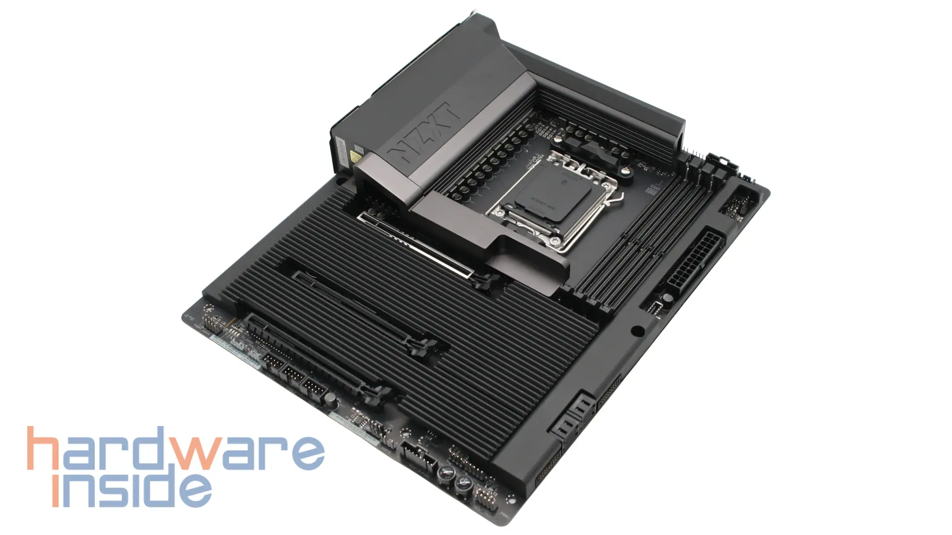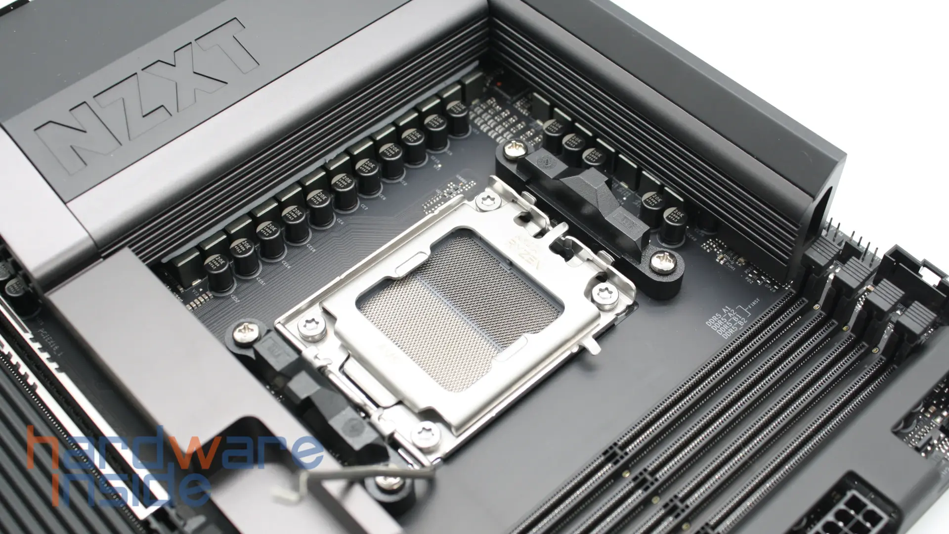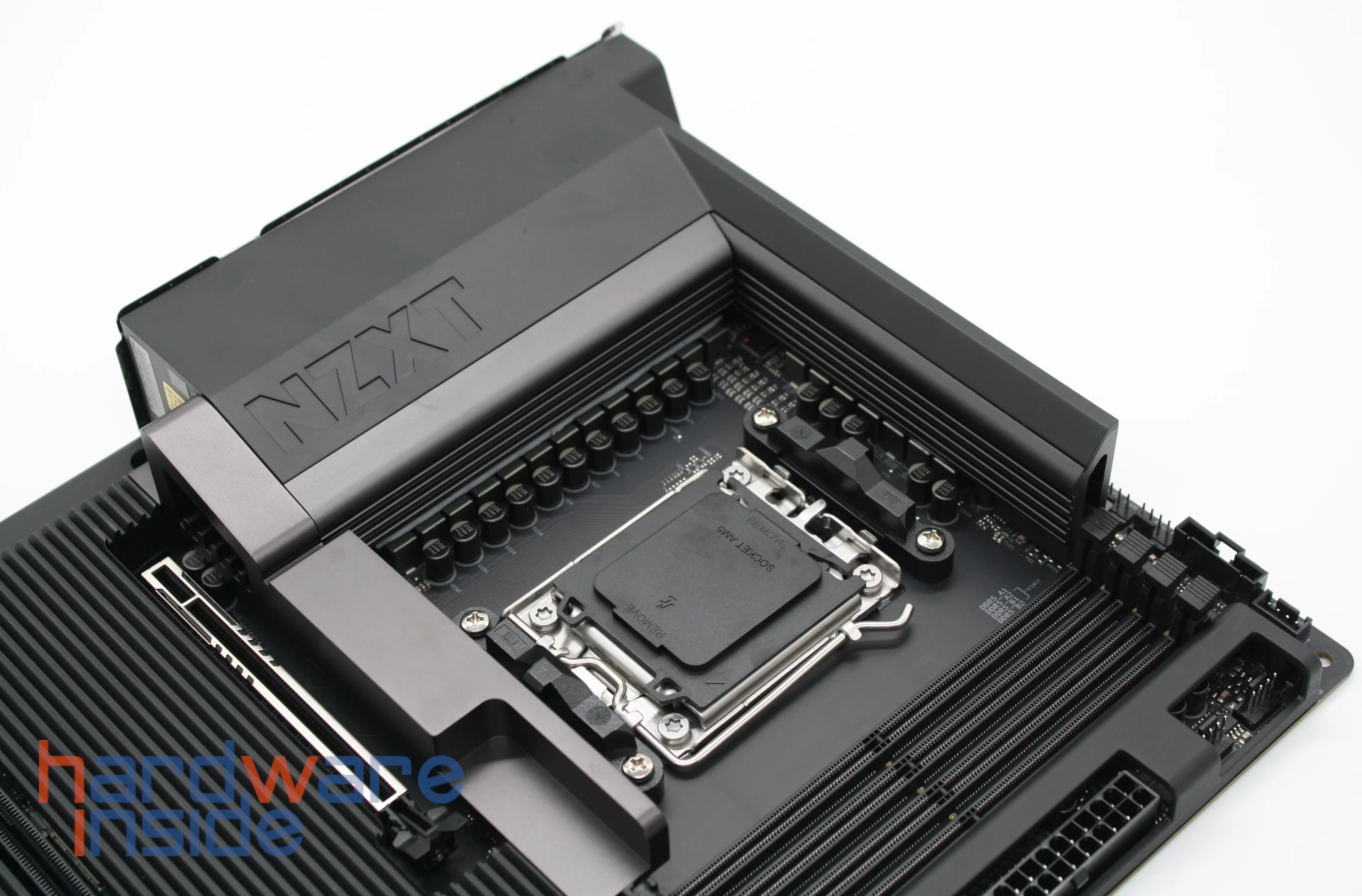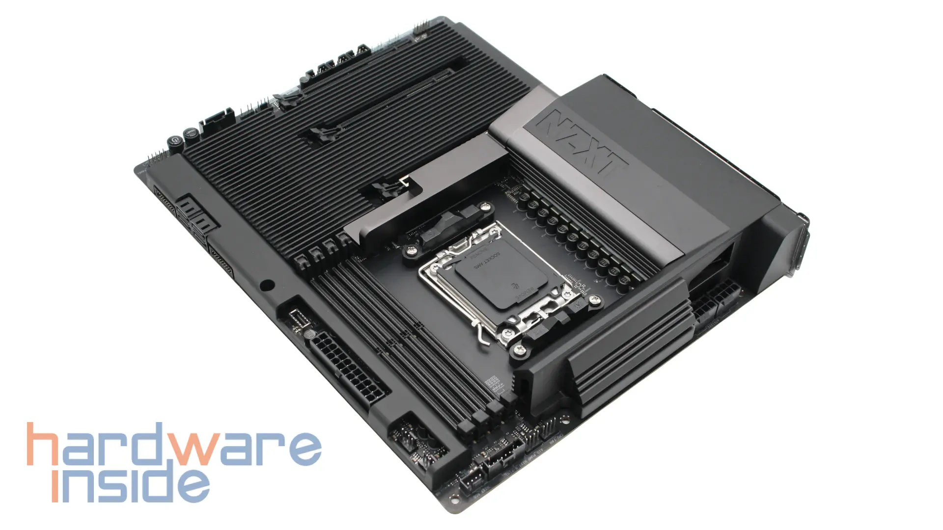 Auf der Oberseite des Mainboards befinden sich zwei 8-Pin-PCIe-Power-Anschlüsse zur Versorgung des Prozessors. Rechts oben sind ein CPU-Lüfter und ein AIO-Pump-Anschluss sowie ein NZXT-8-Pin- und ein NZXT-RGB-Anschluss verbaut.