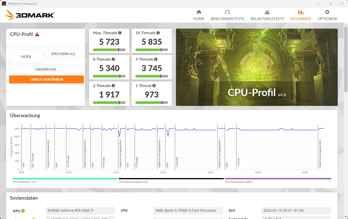 Auch die 3DMark-Benchmarks zeigen, dass das System eine gute Leistung erbringt. Im CPU-Profil-Test wird die CPU explizit auf ihre Leistung überprüft. Die kleine 6-Kern-CPU kann hier zeigen, was sie draufhat. Zwar gehört die CPU zu den schwächeren Vertretern der AM5-CPUs, in den weiteren Benchmarks sehen wir jedoch eine Gaming-Leistung, die mit der von vergleichbaren Systemen mit stärkerer CPU vergleichbar ist. Die Grafikkarte und die CPU arbeiten also sehr gut zusammen und ermöglichen damit eine gute Gaming-Leistung.