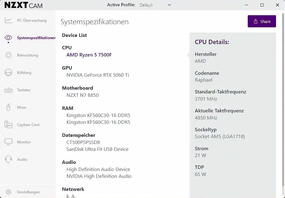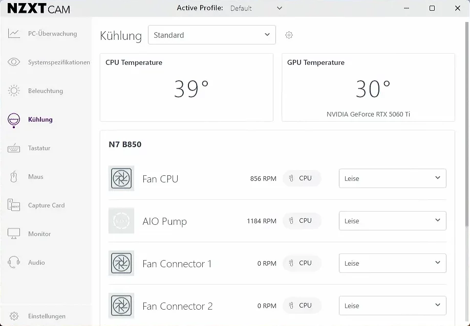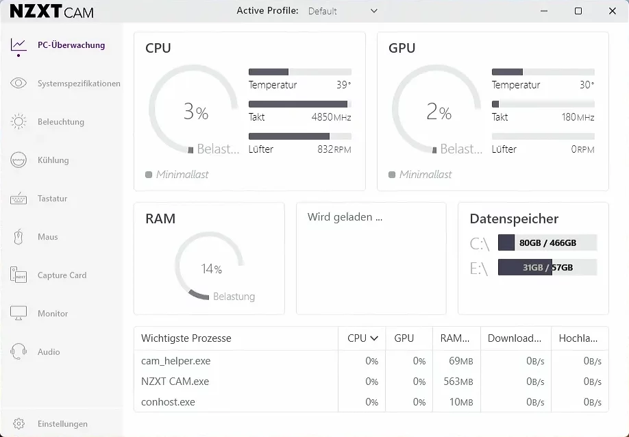 Mit der Software NZXT Cam kann der aktuelle Systemzustand abgerufen werden. Auf der Startseite werden für CPU, GPU, RAM und Datenspeicher einige interessante Metriken angezeigt. Die Software bietet viele Optionen zur Steuerung von RGB-Elementen und Lüfterverhalten sowie einige Optionen für NZXT-Peripheriegeräte, auf die wir an dieser Stelle nicht weiter eingehen. Abgesehen von der RGB- und Lüftersteuerung ist sie als Begleitsoftware für das Mainboard eher informativ. Einstellungen des Systems oder Treiber werden nicht angeboten.