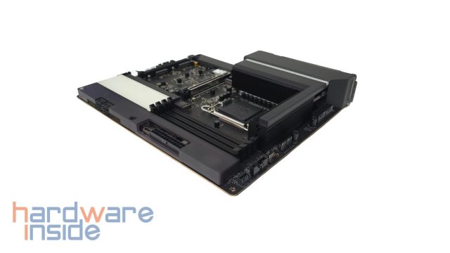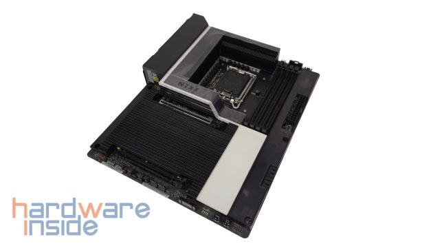Das NZXT N9 Z890 ist in Schwarz und in Weiß erhältlich, wobei wir uns heute das schwarze Modell ansehen. Das PCB ist komplett in Schwarz gehalten und mit besonders großflächigen Kühlkörpern ausgestattet. Auch die VRM-Kühlkörper sind in schwarze Farbe getaucht. An der linken Kante ist eine kleine Abdeckung mit drei Schrauben rückseitig an das Board geschraubt.
