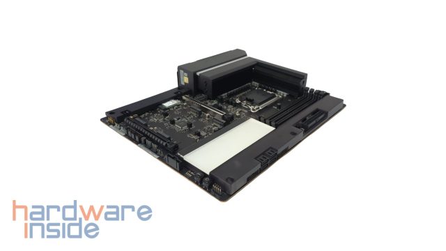 In Sachen NVME‑Steckplätzen ist das Board üppig ausgestattet: So ist unter dem oberen Kühlkörper ein Gen‑5‑Steckplatz und vier weitere Gen‑4‑Steckplätze sind unter dem großen Kühlkörper platziert. Die vier Gen.-4-Steckplätze sind nebeneinander und vertikal angeordnet, was ein interessantes Bild einer ungewohnten Formation darstellt. Die vier Wärmeleitspads an der Unterseite des großen Kühlkörpers stellen den Kontakt zwischen den NVMe“s her, sodass die Wärme hier effektiver abgeleitet werden kann.