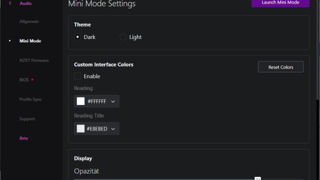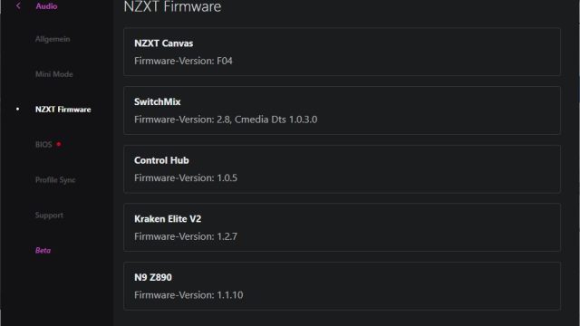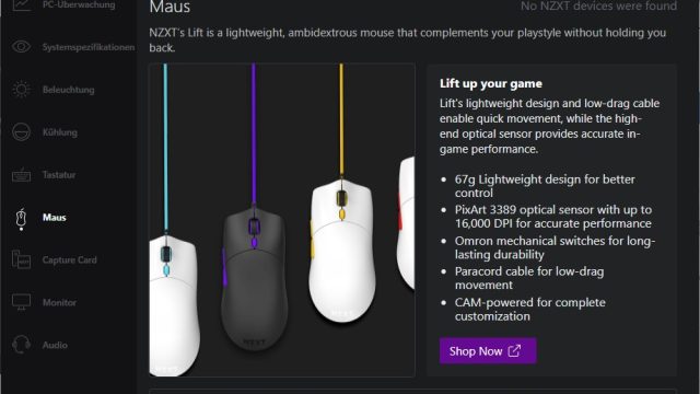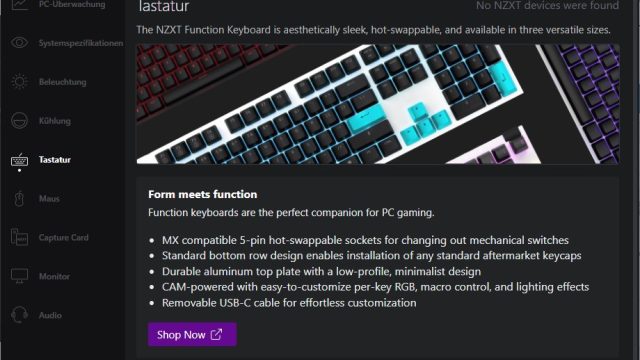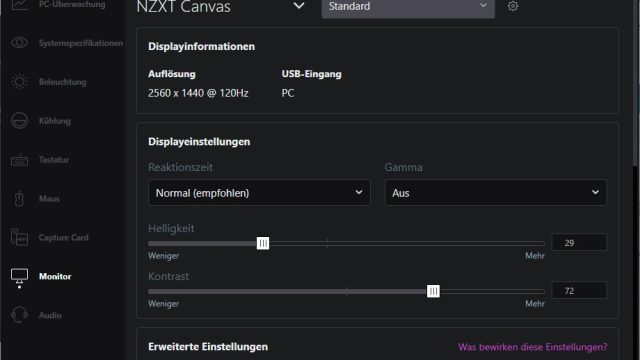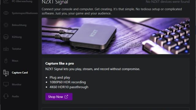 Weiter geht es mit den Rubriken Tastatur und Maus, die auf den Shop verweisen, wenn sich keine dieser Produkte im Besitz befindet. Das gleiche gilt für die Rubrik der Capture Card. Unter der Rubrik Monitor werden weitere detaillierte Einstellungen und Anpassungen für ein NZXT Display offenbart. Auch unter Audio ist eine genaue Anpassung der Peripherie möglich.
