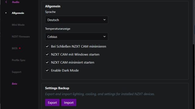 Weitere Einstellungen zur CAM Software selbst können weiter unten vorgenommen werden. Hier bestimmen wir, wie sich die Software beim Starten des Systems und bei Neuerungen der Softwareversion verhält. Ein wichtiger Punkt ist hier der Export und Import der kompletten Einstellungen für den Umzug auf ein anderes System. Panele, Orientierung, Größe von Fenstern, Dark- und Lightmode und Farben können ebenso für die Software angepasst werden. In Sachen Individualisierung kann man sich in der CAM Software jedenfalls austoben.