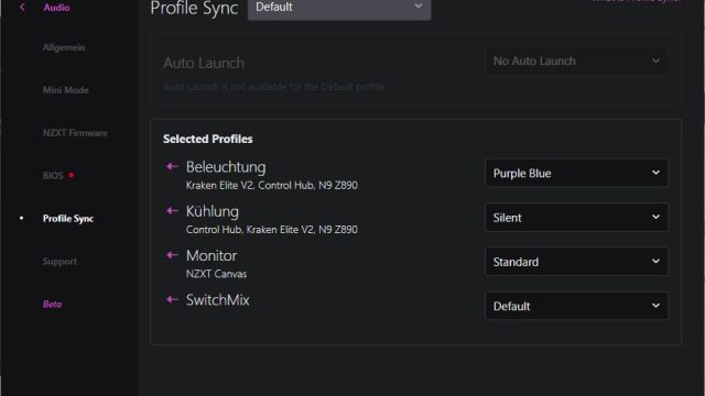 Ebenso ist die Rubrik Kühlung interessant. Ganz wie bei der Beleuchtung sind auch hier neben voreingestellten Belüftungsprofilen anpassbare und individuelle Profile möglich. Hier werden die wichtigsten Temperaturen angezeigt und weiter unten kann jede Komponente einzeln angesteuert werden. Die Kühlung kann der CPU, der GPU oder der Temperatur der Kühlflüssigkeit angepasst werden. Wir empfehlen hier den voreingestellten Leise-Modus, der einen guten Kompromiss zwischen Kühlleistung und Lautstärke bietet.