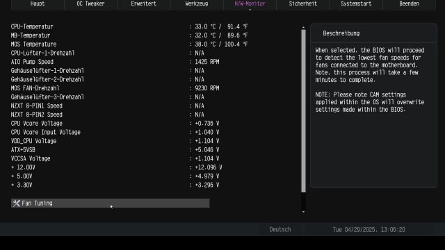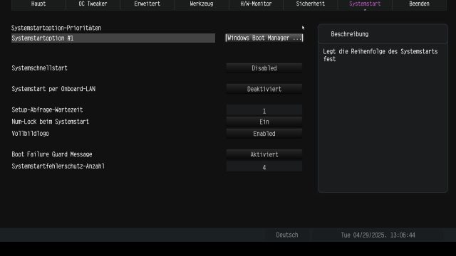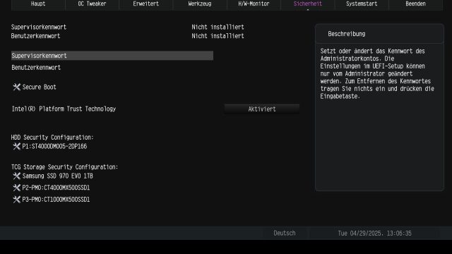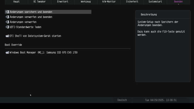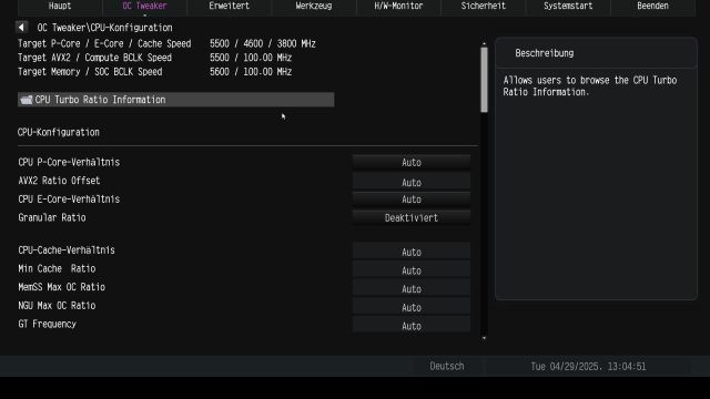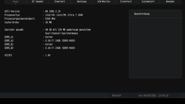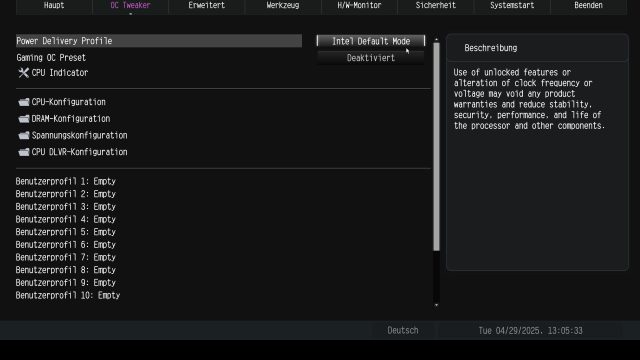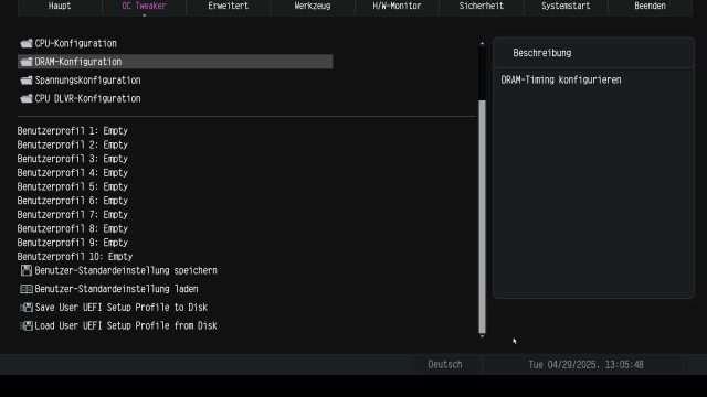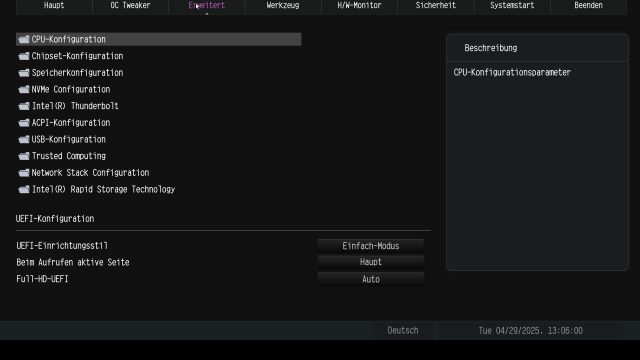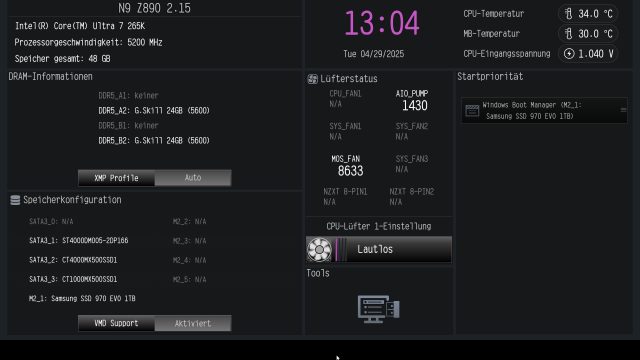 Die Struktur des NZXT-UEFI ist aufgeräumt, hoch aufgelöst und schlicht gestaltet. Ein Zurechtfinden im Menü dauert nicht lange. So haben wir im Hauptbildschirm die wichtigsten Daten auf einer Seite. So auch gleich die Einstellung für das XMP-Profil, das wir von „Automatisch“ auf „Profil-1“ setzen. Für Overclocker ist ein aufgeräumtes BIOS ein Segen. So können die zahlreich angebotenen Einstellungen beim NZXT N9 Z890 schnell gefunden und vorgenommen werden. Das UEFI bietet hierzu viele Sprachen an und Einstellungen zur Spannungsversorgung und Taktraten können in zehn Profilen gespeichert werden. Weiterhin sind viele Einstellungen geboten, die das Verhalten beim Start des Systems beeinflussen, und die einzelnen Statusdaten können ebenfalls ausgelesen werden. Sicherheitseinstellungen und Boot-Optionen dürfen hier natürlich nicht fehlen.