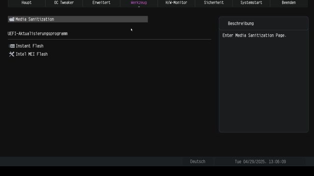 Nach dem Einbau eines neuen Mainboards gilt es als Erstes, ein BIOS-Update durchzuführen. Hier gibt es erfreulicherweise zwei Optionen, dies zu tun. Nach einem Download der Firmware und Speicherung auf einen USB‑Stick kann die neue Version entweder über das UEFI selbst getriggert werden oder man setzt den USB‑Stick im ausgeschalteten Zustand an der Rückseite in den vorgesehenen und markierten USB‑Slot und drückt die Flash-BIOS-Taste für drei Sekunden. Eine kleine LED im Inneren fängt an zu blinken. Nach dem Update hört die LED auf zu blinken und das System kann wieder gestartet werden. Egal ob über das „Werkzeug“ im UEFI oder über die Flash-BIOS-Taste, der Vorgang dauert nur einige wenige Minuten.