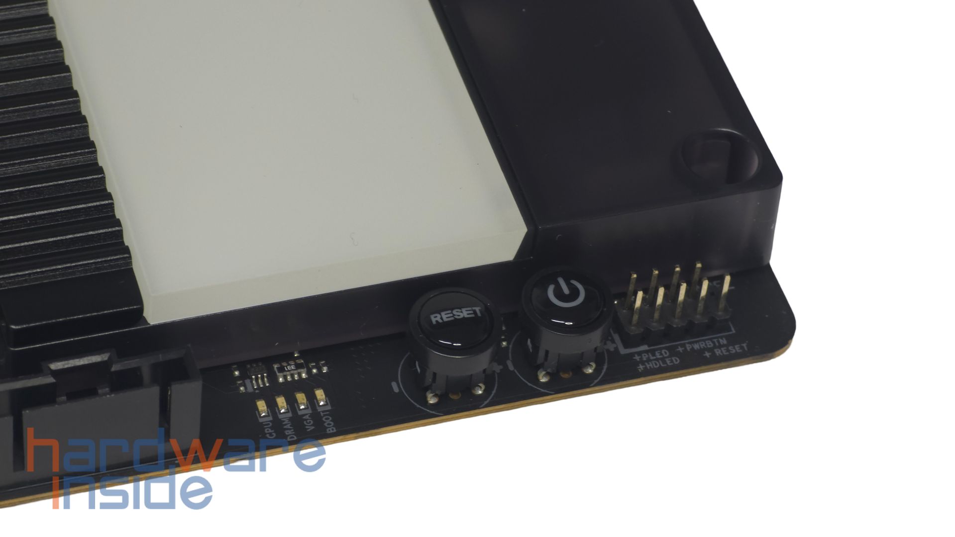 An der rechten Kante ist ebenfalls eine Abdeckung angebracht, die mit sechs Schrauben an der Mainboardrückseite fixiert ist. Diese Abdeckung ist mit einem dünnen Flachband an dem Motherboard angeschlossen, dort befindet sich eine RGB-Oberfläche. Die rechte Abdeckung hat ein milchiges Design, um so die Digicode-Anzeige sichtbar zu machen. Die RGB-Oberfläche erstreckt sich von rechts unten nach links oben, über den NVMe-Kühlkörper, weiter bis nach oben an dem VRM-Kühlkörper vorbei. Das Design ist sauber und gut gelungen, sodass wenig von der eigentlichen Platine zu sehen ist. Das Mainboard ist praktisch „verkleidet“, wenn man so will.
