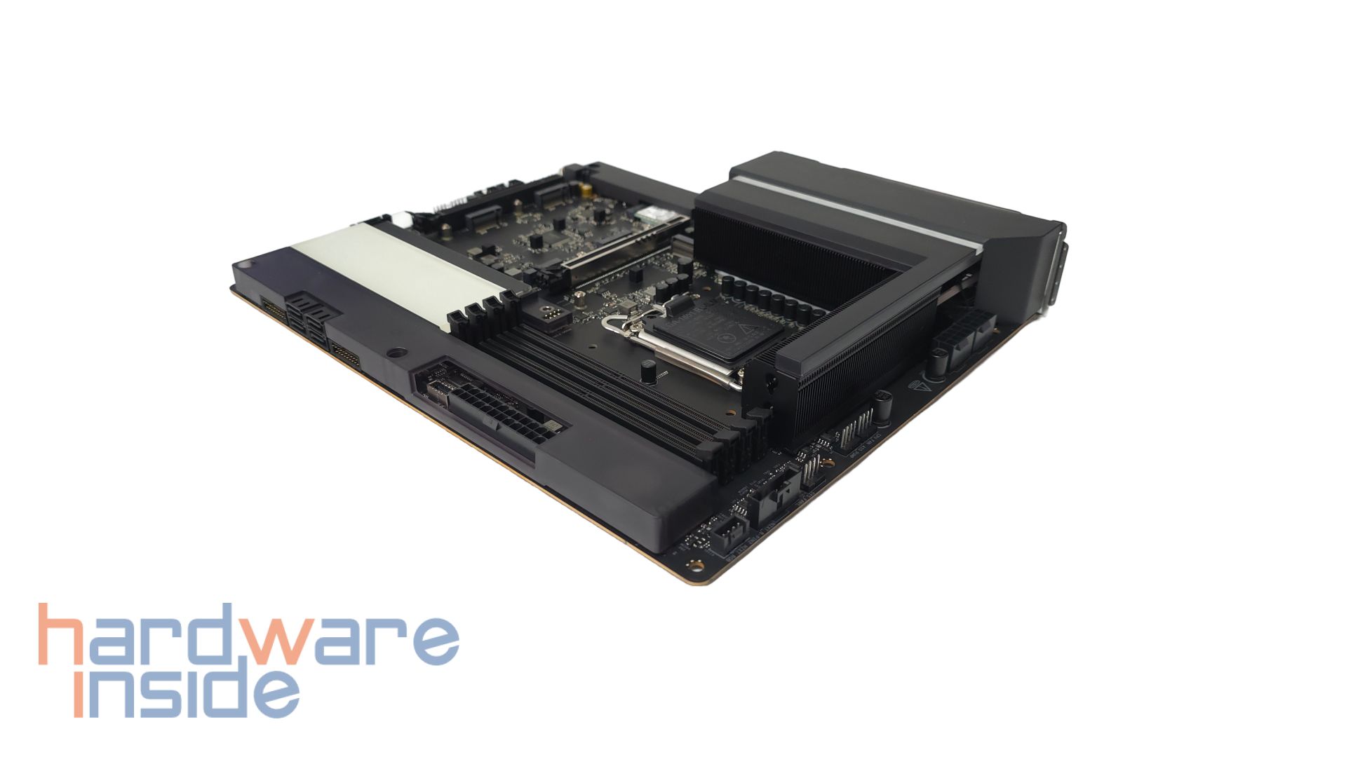 Der VRM-Kühlkörper ist ziemlich groß und bedeckt einiges an Fläche auf der oberen Seite des Mainboards. Besonders ist hier das Kühl-Finnen-Layout, sodass passiv die Wärme leicht abgeleitet werden kann. Die zwei Teile des Kühlkörpers sind innen mit einer Heatpipe verbunden. Zusätzlich befinden sich unter dem Kühlkörper noch zwei Lüfter, die die warme Luft hinten an der Backplate heraustransportieren. Diese Lüfter können aber leider nur ein- oder ausgeschaltet werden, was sich auf die Geräuschkulisse auswirkt.