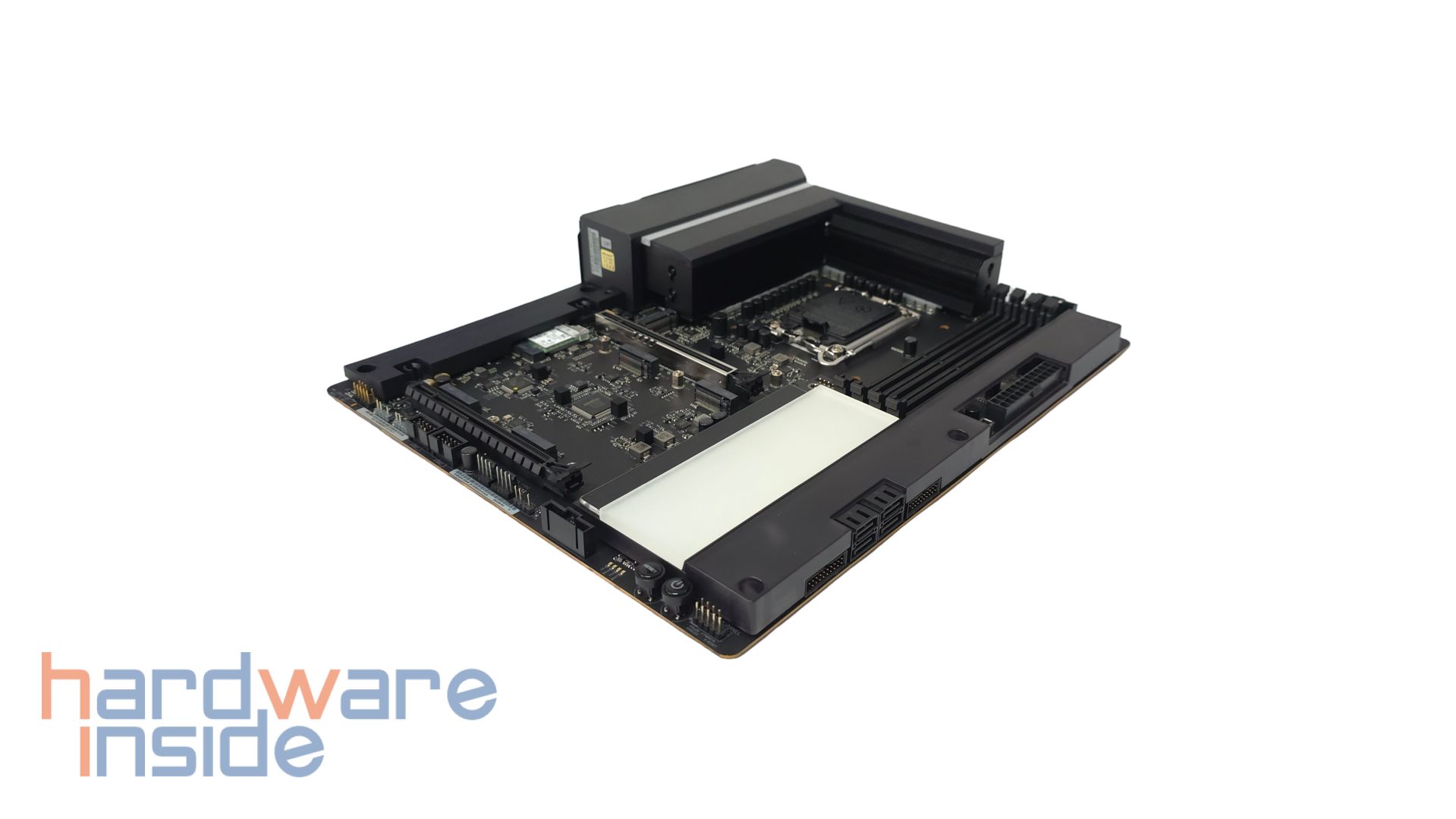 Der massive und ebenfalls metallische Kühlkörper an der unteren Hälfte des N9 Z890 kann an der linken Seite angehoben und somit vom Mainboard entfernt werden. An der Unterseite sind vier Wärmeleitpads angebracht, um die Wärme der vier M.2-Slots im Betrieb effektiv ableiten zu können.