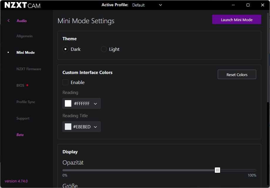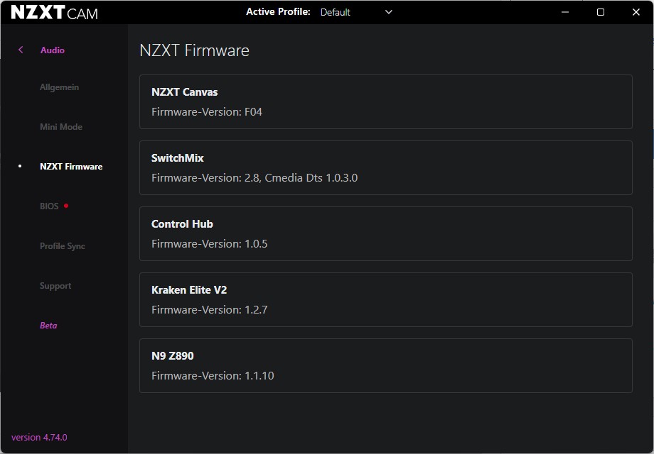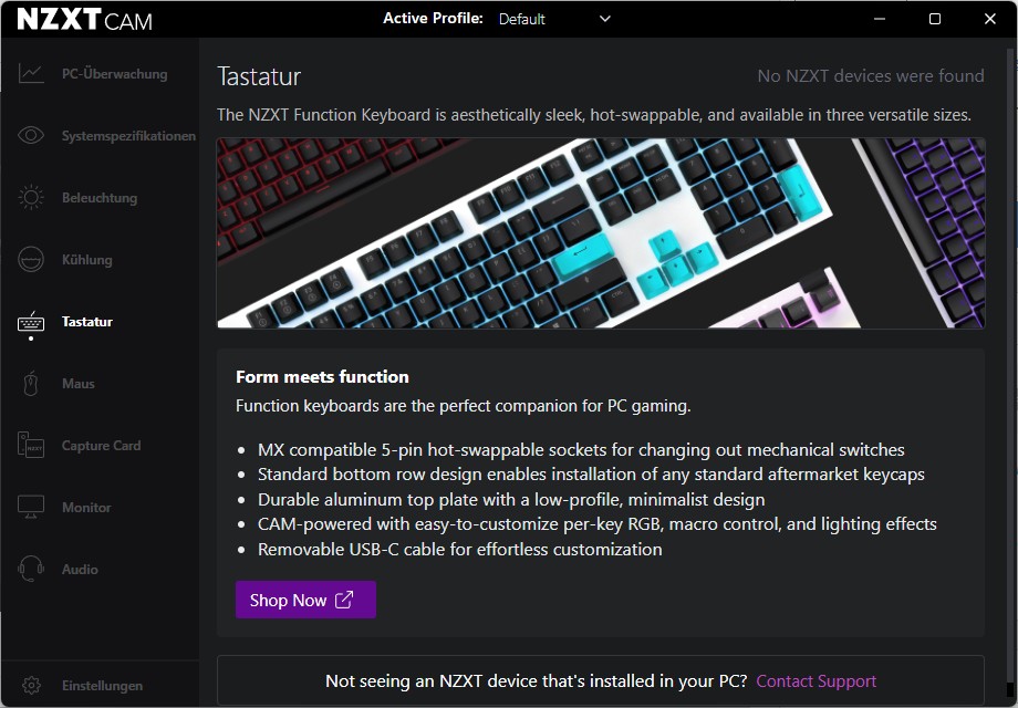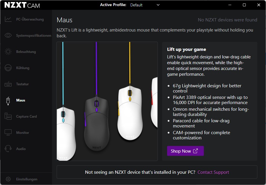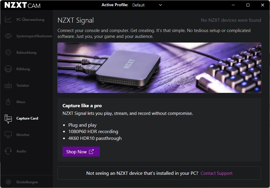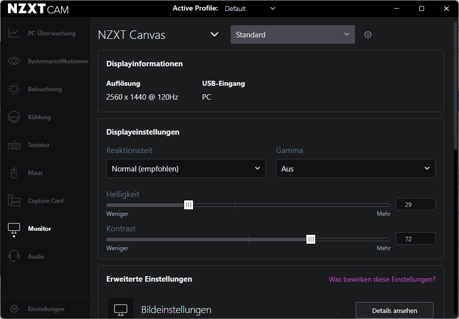 Weiter geht es mit den Rubriken Tastatur und Maus, die auf den Shop verweisen, wenn sich keine dieser Produkte im Besitz befindet. Das gleiche gilt für die Rubrik der Capture Card. Unter der Rubrik Monitor werden weitere detaillierte Einstellungen und Anpassungen für ein NZXT Display offenbart. Auch unter Audio ist eine genaue Anpassung der Peripherie möglich.