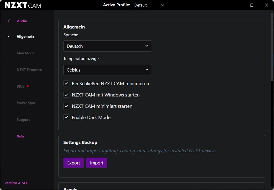 Weitere Einstellungen zur CAM Software selbst können weiter unten vorgenommen werden. Hier bestimmen wir, wie sich die Software beim Starten des Systems und bei Neuerungen der Softwareversion verhält. Ein wichtiger Punkt ist hier der Export und Import der kompletten Einstellungen für den Umzug auf ein anderes System. Panele, Orientierung, Größe von Fenstern, Dark- und Lightmode und Farben können ebenso für die Software angepasst werden. In Sachen Individualisierung kann man sich in der CAM Software jedenfalls austoben.