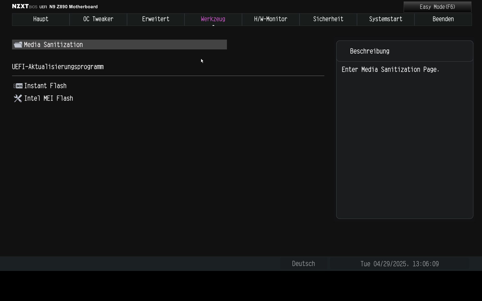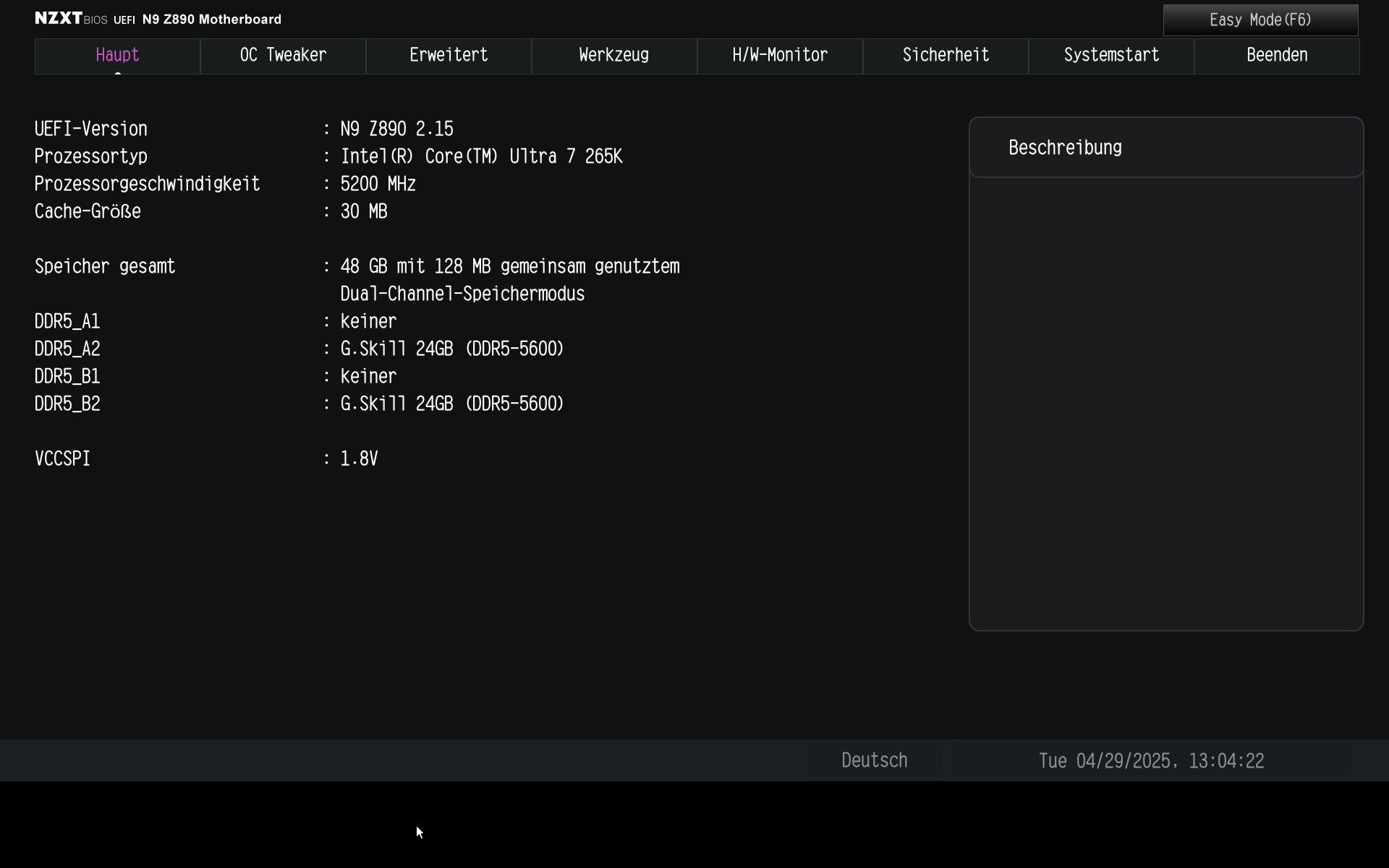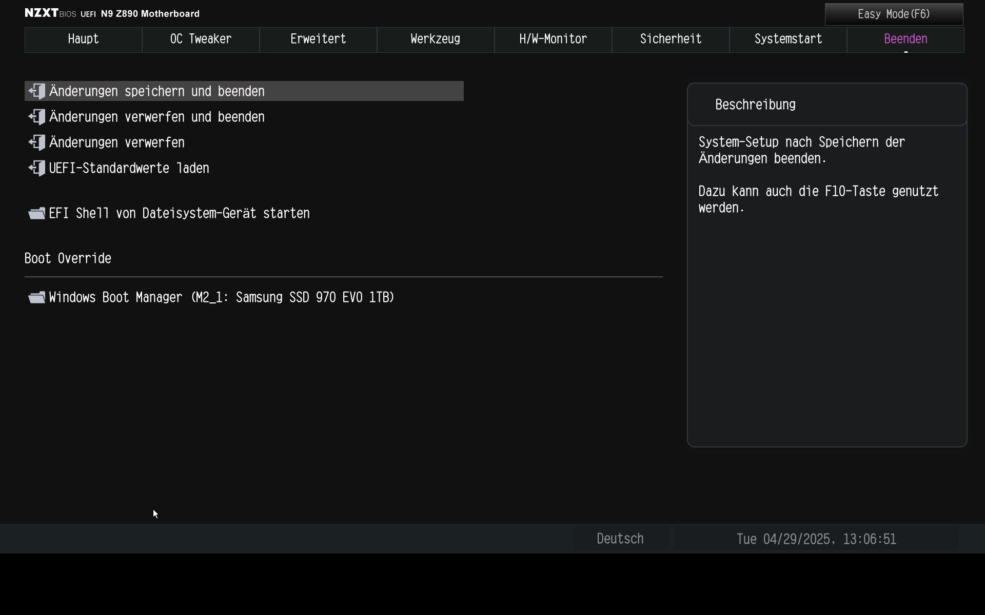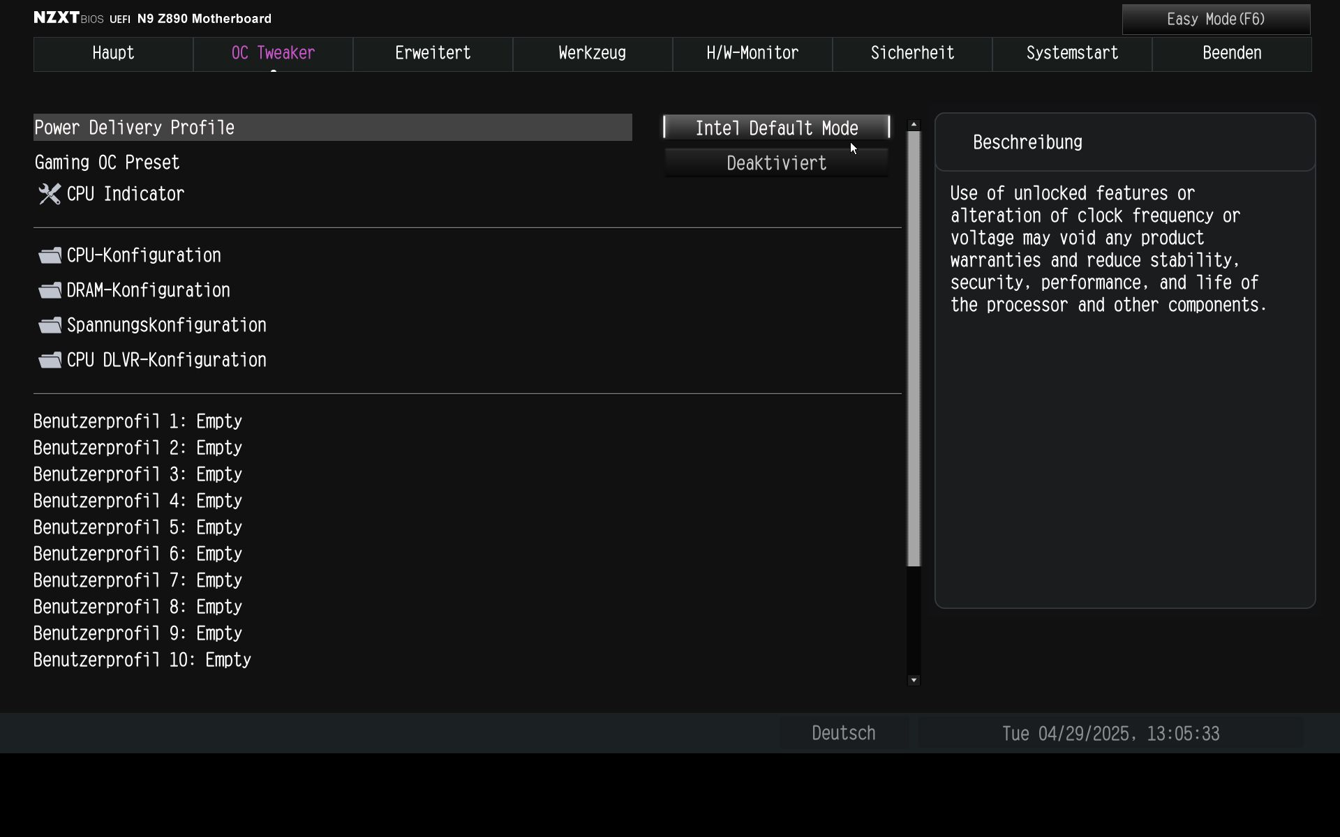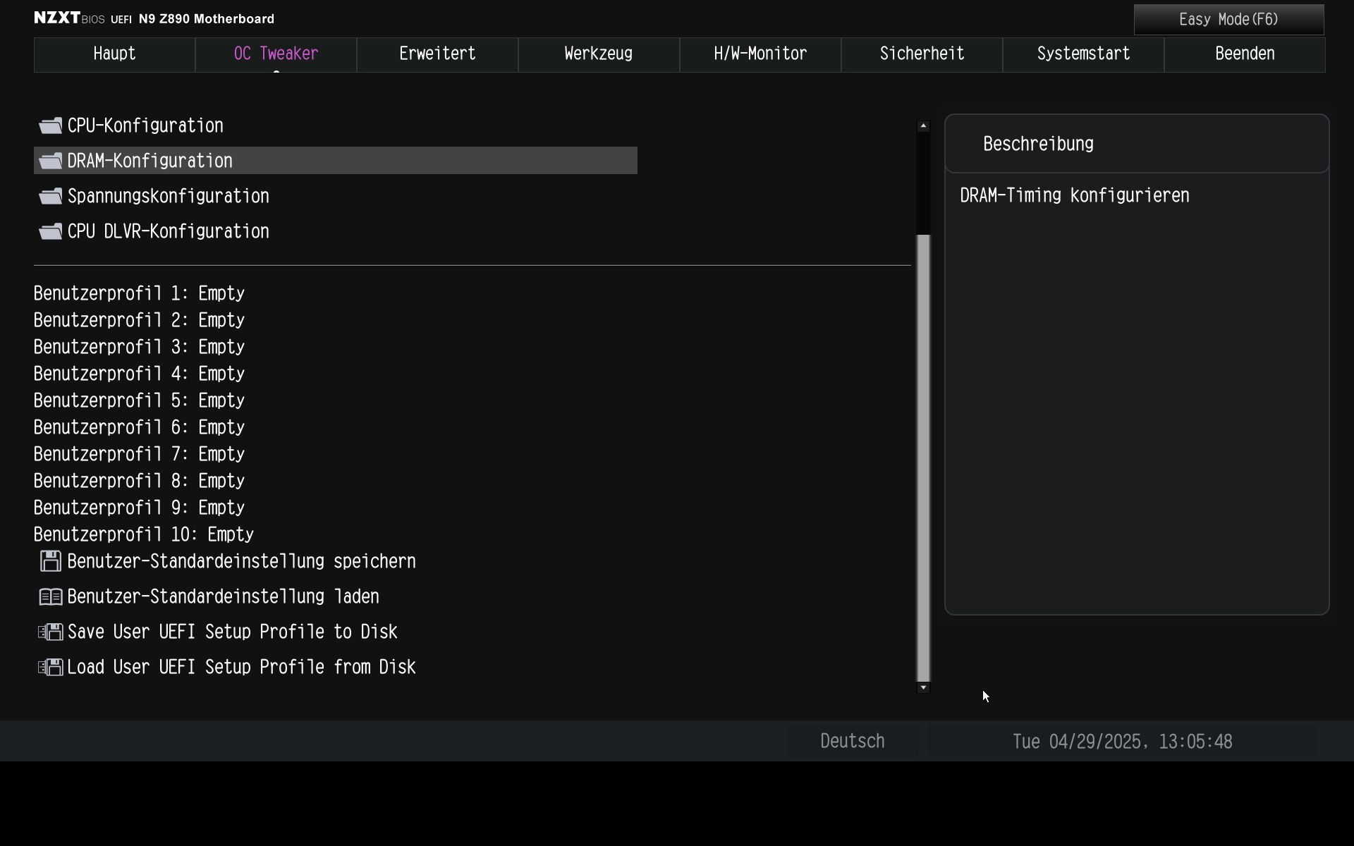 Die Struktur des NZXT-UEFI ist aufgeräumt, hoch aufgelöst und schlicht gestaltet. Ein Zurechtfinden im Menü dauert nicht lange. So haben wir im Hauptbildschirm die wichtigsten Daten auf einer Seite. So auch gleich die Einstellung für das XMP-Profil, das wir von „Automatisch“ auf „Profil-1“ setzen. Für Overclocker ist ein aufgeräumtes BIOS ein Segen. So können die zahlreich angebotenen Einstellungen beim NZXT N9 Z890 schnell gefunden und vorgenommen werden. Das UEFI bietet hierzu viele Sprachen an und Einstellungen zur Spannungsversorgung und Taktraten können in zehn Profilen gespeichert werden. Weiterhin sind viele Einstellungen geboten, die das Verhalten beim Start des Systems beeinflussen, und die einzelnen Statusdaten können ebenfalls ausgelesen werden. Sicherheitseinstellungen und Boot-Optionen dürfen hier natürlich nicht fehlen.
