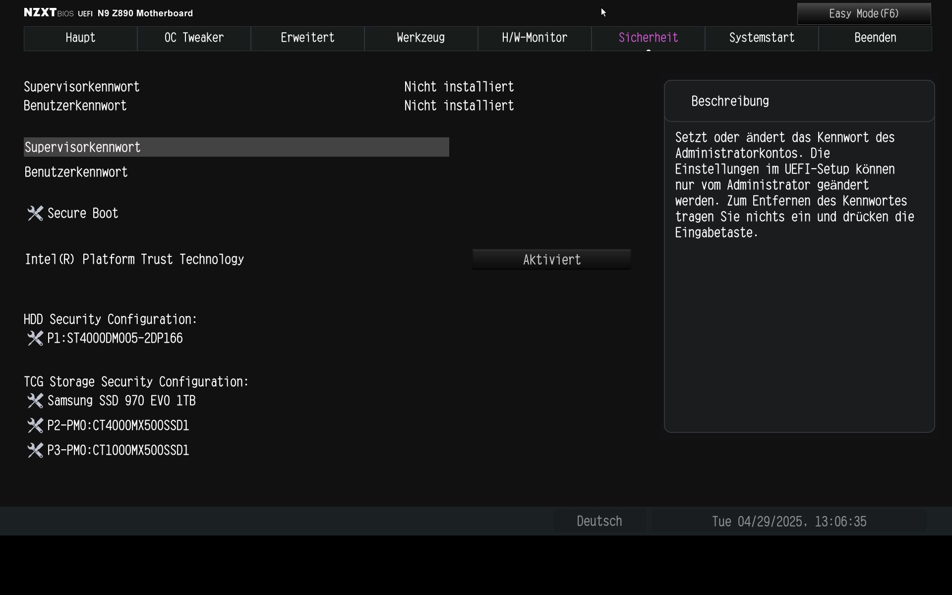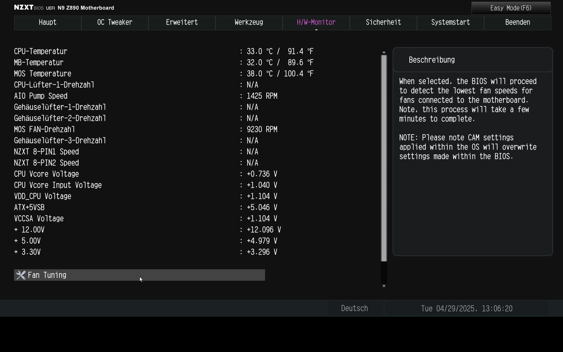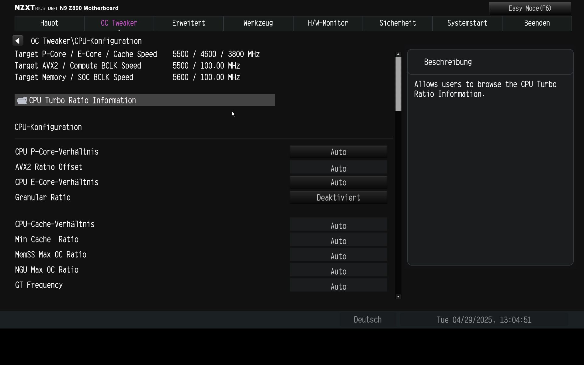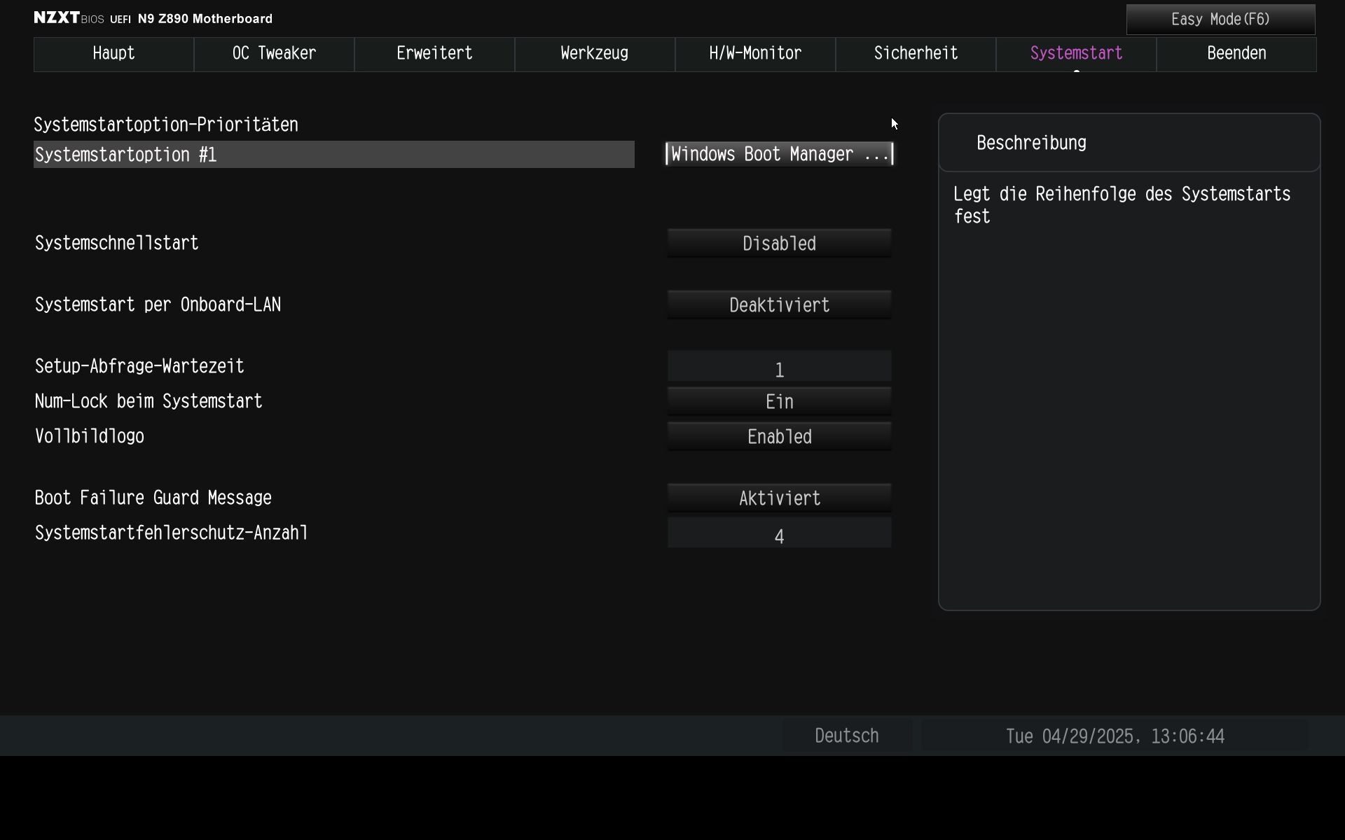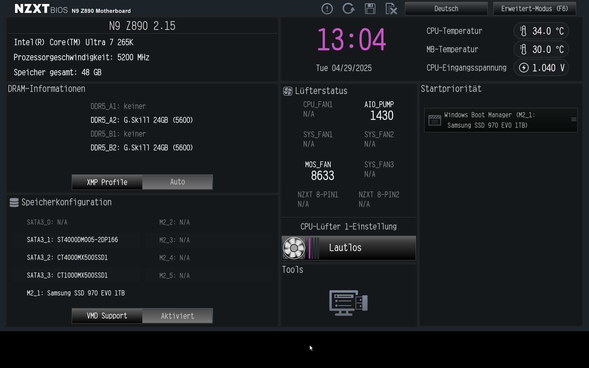 Die Struktur des NZXT-UEFI ist aufgeräumt, hoch aufgelöst und schlicht gestaltet. Ein Zurechtfinden im Menü dauert nicht lange. So haben wir im Hauptbildschirm die wichtigsten Daten auf einer Seite. So auch gleich die Einstellung für das XMP-Profil, das wir von „Automatisch“ auf „Profil-1“ setzen. Für Overclocker ist ein aufgeräumtes BIOS ein Segen. So können die zahlreich angebotenen Einstellungen beim NZXT N9 Z890 schnell gefunden und vorgenommen werden. Das UEFI bietet hierzu viele Sprachen an und Einstellungen zur Spannungsversorgung und Taktraten können in zehn Profilen gespeichert werden. Weiterhin sind viele Einstellungen geboten, die das Verhalten beim Start des Systems beeinflussen, und die einzelnen Statusdaten können ebenfalls ausgelesen werden. Sicherheitseinstellungen und Boot-Optionen dürfen hier natürlich nicht fehlen.