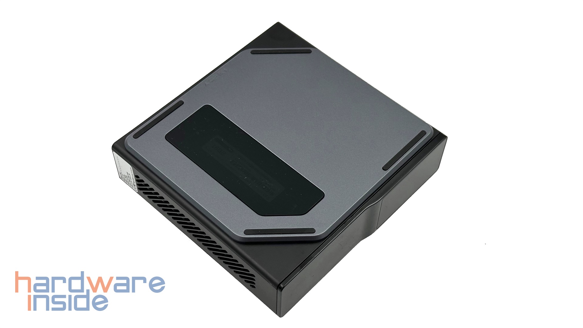 Sehen wir uns zunächst die linke Seite des OUVIS S1 Mini-PCs genauer an. Dieser verfügt nicht nur über vier Gummifüße zum horizontalen Aufstellen, sondern auch über ein kleines Sichtfenster. Dieses ist sehr dunkel getönt, sodass der dahinter liegende Arbeitsspeicher ganz schwach zu sehen ist. Über den Sinn kann man an dieser Stelle wohl streiten. Gut hingegen ist, dass sich das Seitenteil ohne den Einsatz von Werkzeug entfernen lässt, denn es haftet magnetisch am Gehäuse. An der Unterseite (wenn der PC vertikal gestellt wird) sehen wir eine Reihe Belüftungsöffnungen.