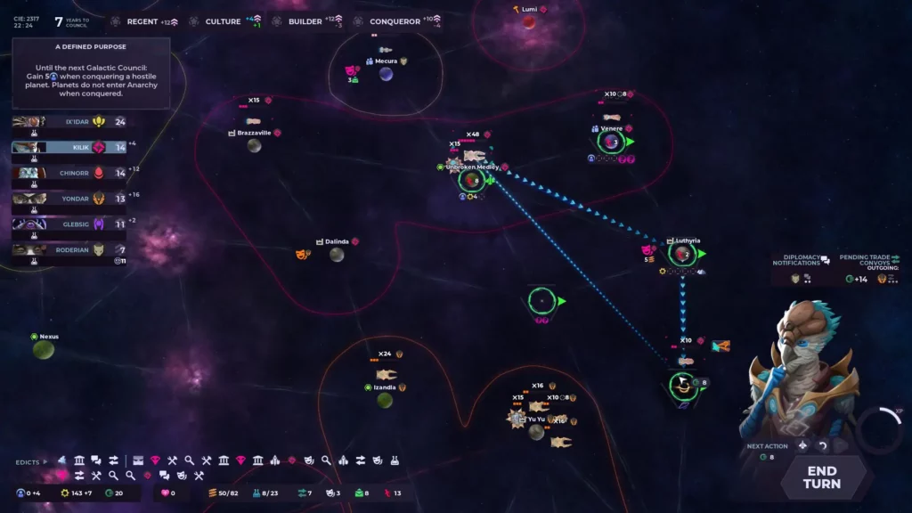 - Diplomatie oder „Diplomatie“: Ausgehend vom sicheren Hafen ihrer Heimatwelt können die Spieler ihre Reichweite schnell über die Galaxis ausdehnen, um neue Systeme zu erforschen und zu besetzen und schließlich die Kontrolle über die Thronwelt Nexus zu übernehmen. Militärische Konflikte und diplomatische Verhandlungen stehen zur Verfügung, während die Spieler expandieren und erforschen. Aber es gibt auch den Machtkampf, der im Galaktischen Rat stattfindet, wenn rivalisierende Imperien ihren Einfluss nutzen, um für neue Titel und Resolutionen zu stimmen, um ihre Fraktion zu stärken oder ihre unmittelbaren strategischen Ziele voranzutreiben.