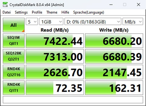 Mit dem AMD Ryzen 7 5700G erreichen wir im Crystal Disk Mark mit 3.727 MB/s im Lesen und 3.515 MB/s im Schreiben – bedingt durch PCIe 3.0 Anbindung – ziemlich genau die erwartete halbe Performance im Vergleich zu PCIe 4.0.