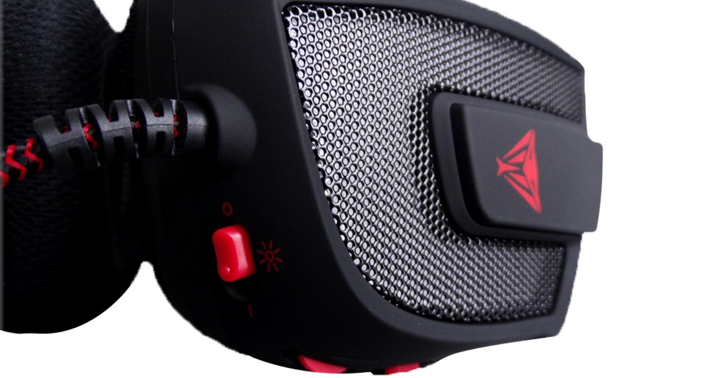 Alle wichtigen Bedienelemente sind auf der linken Seite untergebracht. Hier finden wir ein Rad zum regulieren der Lautstärke und zwei Schieberegler, der eine Regler schaltet die Beleuchtung ein bzw. aus, der andere Regler schaltet eine Bassboost Funktion ein bzw. aus. Auf der linken Seite finden wir auch den Mikrofonarm, der sich ausklappen lässt. Der Mikrofonarm ist starr und lässt sich somit nicht zurechtbiegen. Von der linken Seite geht auch das 2,2 m lange USB Anschlusskabel ab. Es ist mit einem rot/schwarzen Gewebe ummantelt und macht einen hochwertigen Eindruck auf uns. Zudem hat Patriot hier auch ein Klettband angebracht, so kann das Kabel beim Transport und Nichtnutzung ordentlich aufgewickelt werden.