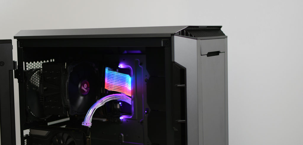 Auch während das System läuft, ist der Eindruck mächtig. Das edle Design und der Farbton in Anthrazit sind sehr angenehm. Die Höhe des Mainboardtrays zeigt uns sehr gut, dass über dem Mainboard noch ordentlich Platz ist. Ein 25 mm Radiator mit 25 mm Lüftern können dort perfekt arbeiten.