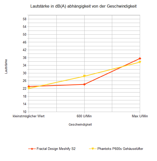 Mit an Board befinden sich vier 120 mm Lüfter von Phanteks ohne RGB-Beleuchtung. Die Range der Lüfter ist zwischen 300 und 1000 RPM. Mit 300 RPM sind die Lüfter sehr ruhig und nicht hörbar. Die Scheibe und die Verkleidung dämpft den Schall um 3 bis 4 dB(A). Wichtig ist der Airflow, der bei geöffneten Seiten keinen Unterschied zeigt. Aber die Hinzunahme der Lüfter zum CPU-Kühler im Tower-Design ergab, dass die Gehäuselüfter die Temperatur der CPU um 3 Grad reduziert.