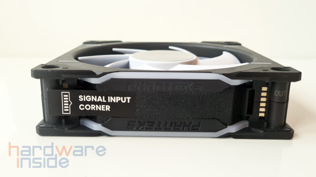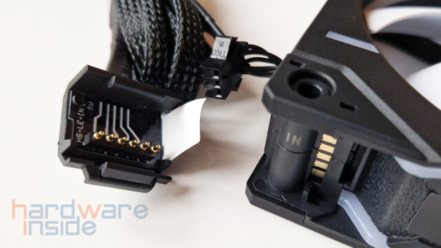 Über das im Lieferumfang beigefügte SIGNAL-INPUT-Kabel wird die Verbindung am ersten oder am letzten Lüfter magnetisch hergestellt. So muss nur noch der 4-Pin-PWM-Stecker mit dem Mainboard verbunden und der +5 V RGB an den passenden Anschluss auf dem Mainboard angeschlossen werden. Die Steuerung der Lüftergeschwindigkeit und die Ansteuerung der ARGB-Beleuchtung erfolgen dann über die jeweilige Mainboard-Software.