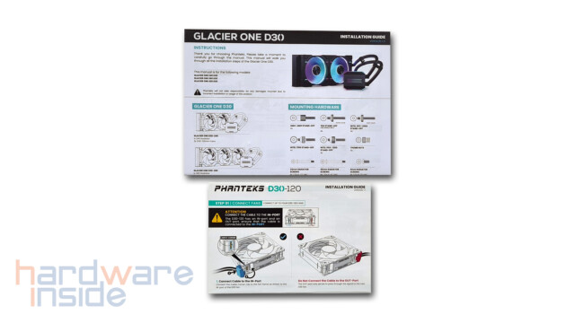 Neben der PHANTEKS Glacier One 360D30, die sicher in zwei Plastikbeuteln verpackt ist, befindet sich auch noch ein kleiner schwarzer Karton mit folgendem Inhalt im Lieferumfang: