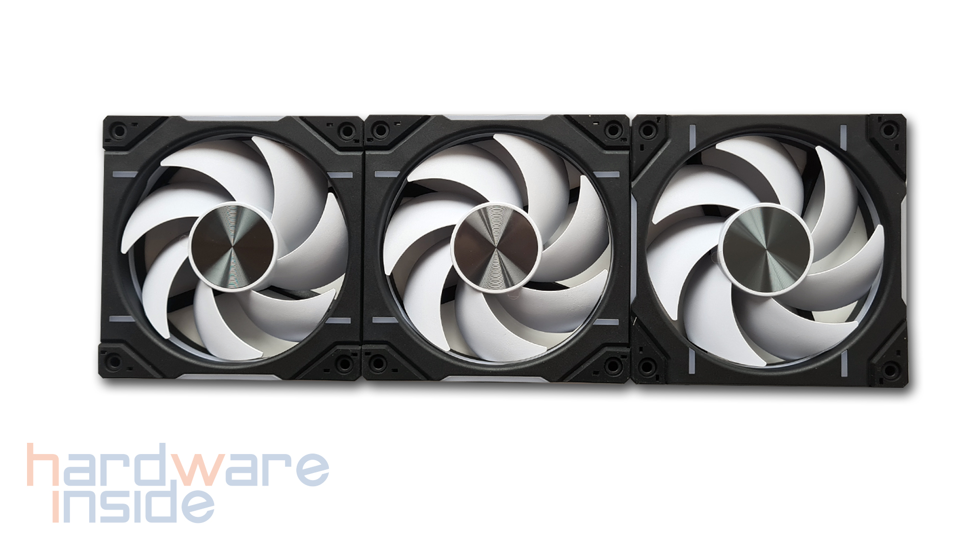 Der Lüfterrahmen des D30-120 ist komplett in Schwarz gehalten, passend dazu sind die leicht milchig weißen Lüfterblätter mit einer leichten Transparenz versehen und mit dem mittig aufgebrachten spiegelnden Aufkleber machen sie vorab einen guten und sauber verarbeiteten Eindruck. Auch zwei milchige Streifen auf jeder Seite und ein breiter Streifen im Inneren fallen bei näherer Betrachtung des Lüfterrahmens direkt ins Auge. Diese werden im Betrieb von insgesamt 30 D-RGB LEDs beleuchtet.