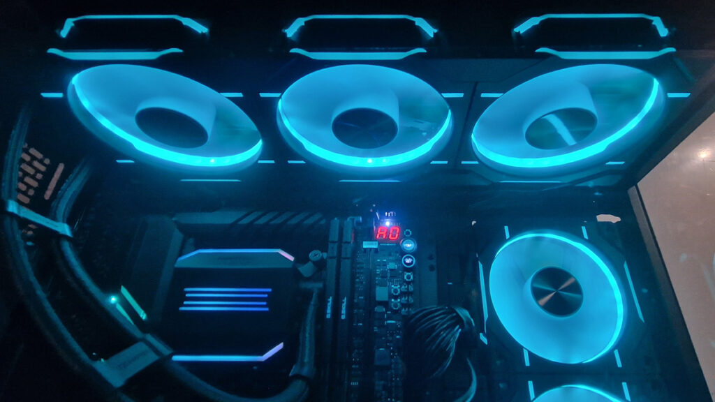 Der Einbau geht gut und unkompliziert von der Hand. Die im Lieferumfang enthaltene Backplate wird mittels der Arretierung für das passende System (Intel oder AMD) verwendet. In unserem Fall ist es der Sockel LGA 1700. Da sich die Wärmeleitpaste schon ab Werk auf dem Kühlerboden befindet, wird nach dem Eindrehen der Abstandshalter der Kühler direkt montiert und mit den mitgelieferten Rändelschrauben befestigt. Wir entscheiden uns für den Einbau der AIO On Top. Drei PAHNTEKS D30-120 mm Lüfter finden ihren Platz rechts neben dem Mainboard und sollen für eine kleine Luftzirkulation im Gehäuse sorgen. Dank des Daisy Chaining entfällt das lästige Verlegen von mehreren Lüfterkabeln. Alle benötigten Kabel werden angeschlossen und nochmals kontrolliert, fertig. Die Optik des Radiators in Verbindung mit der Farbgebung der drei D30-120 Lüfter sieht einfach klasse aus. Da wir ein Mainboard der Firma ASUS nutzen, kommt die Amoury-Crate Software zum Einsatz.