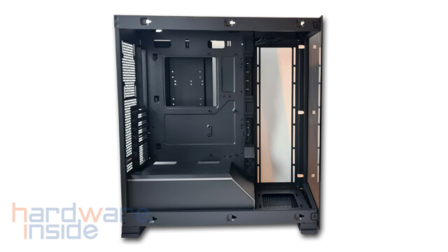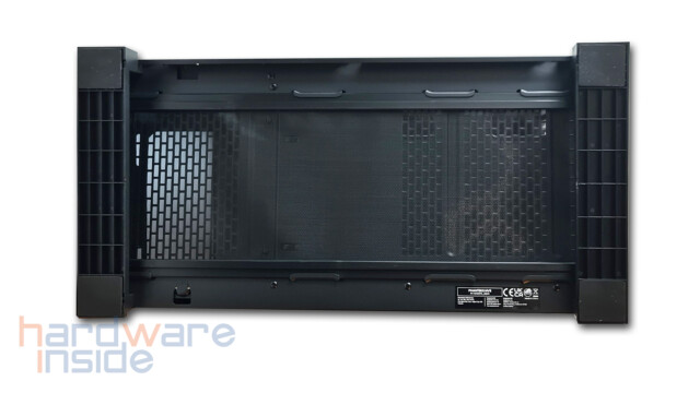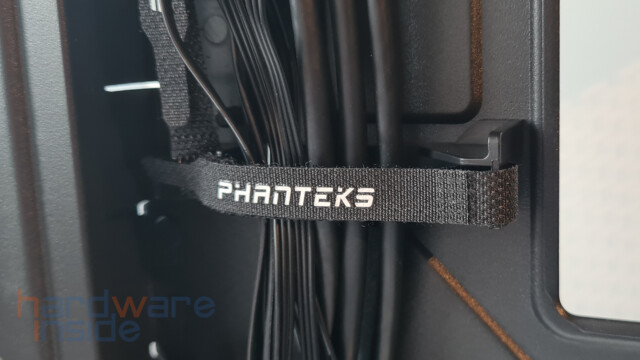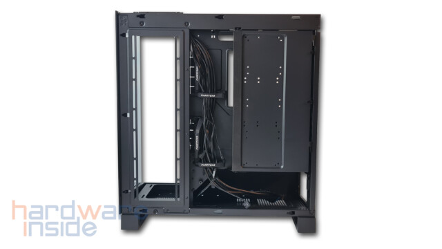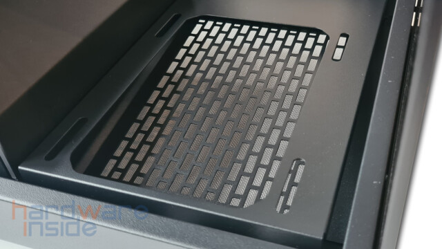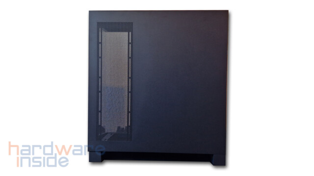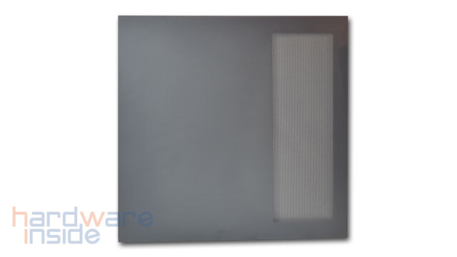 Das aus Stahlblech gefertigte Seitenteil ist mittels zweier Rändelschrauben am Gehäuse befestigt und kann durch Lösen leicht entnommen werden. Ein Ausschnitt aus feiner Mesh-ähnlicher Perforierung, dient zum einen als Staubfilter und zum anderen bei der inneren Montage von drei 120 mm Lüftern rechts neben dem Mainboard oder einem 360 mm Radiator für eine bessere Luftzirkulation. Durch die zahlreichen Klettverschlüsse wird das Verlegen der Kabel zum Kinderspiel.