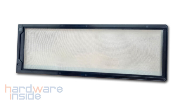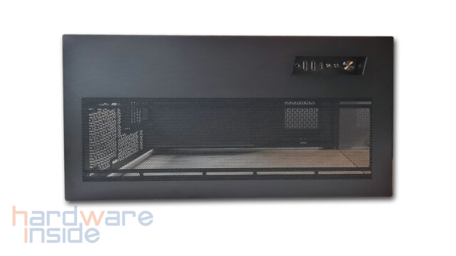 Im Deckel selbst befindet sich eine große Belüftung in Mesh-Optik, welches eine stimmige Einheit mit dem rechten Seitenteil und der Rückseite bildet. Durch die Entnahme des Deckels ist eine Installation von drei 120 mm Lüftern oder einem 360 mm Radiator gegeben. Hier befindet sich auch das I/O-Panel. Darin sind die Reset-Taste gefolgt von dem Power-Button, dahinter folgen zwei Tasten für den ARGB-Beleuchtungsmodus und dem ARGB-Farbmodus und eine kombinierte 3,5 mm Audioklinkenbuchse, ein USB-C und zwei USB 3.0 Typ-A-Buchsen untergebracht.
