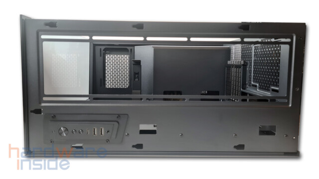 Die rückseitig angebrachte Klappe dient als Laufwerkträger, die leicht geöffnet werden kann. So lassen sich z. B. vier 2,5“ SSDs oder drei 3,5“ HDDs verbauen. Gleichzeitig gibt er den Blick auf den rückseitigen Bereich des Mainboards frei, wo sich die CPU befindet. Hier kann dann bei Bedarf die Backplate (bei Installation einer AIO) montiert bzw. gewechselt werden.
