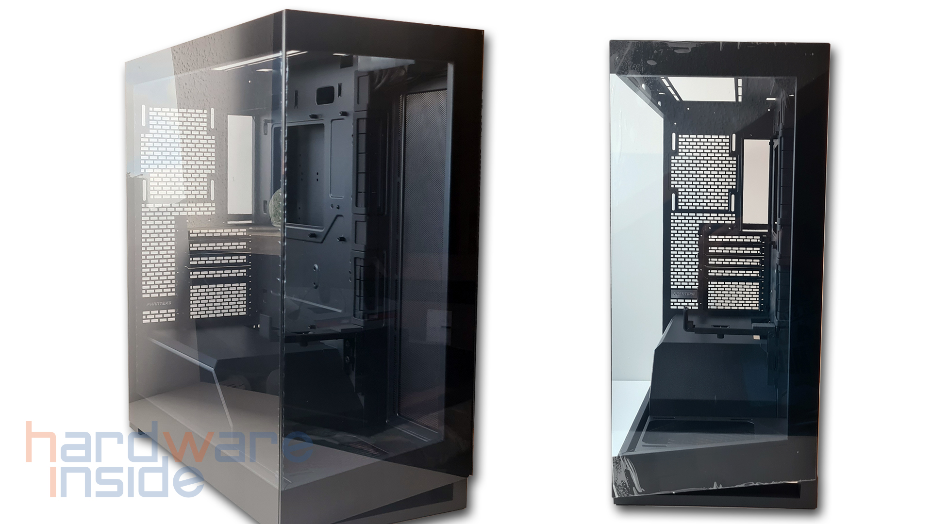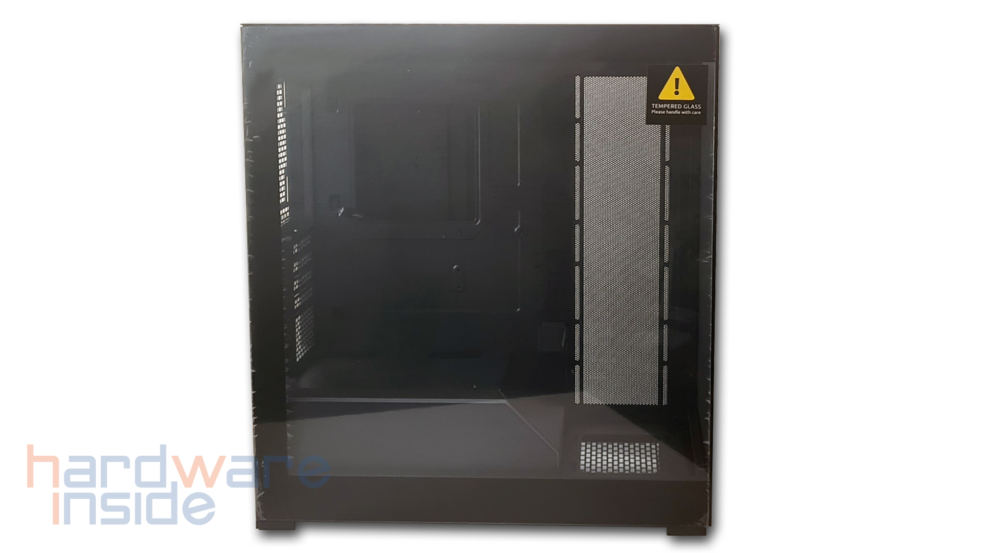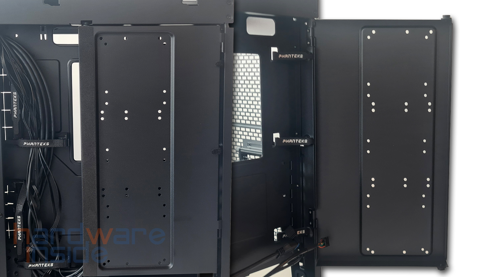 Das aus Stahlblech gefertigte Seitenteil ist mittels zweier Rändelschrauben am Gehäuse befestigt und kann durch Lösen leicht entnommen werden. Ein Ausschnitt aus feiner Mesh-ähnlicher Perforierung, dient zum einen als Staubfilter und zum anderen bei der inneren Montage von drei 120 mm Lüftern rechts neben dem Mainboard oder einem 360 mm Radiator für eine bessere Luftzirkulation. Durch die zahlreichen Klettverschlüsse wird das Verlegen der Kabel zum Kinderspiel.