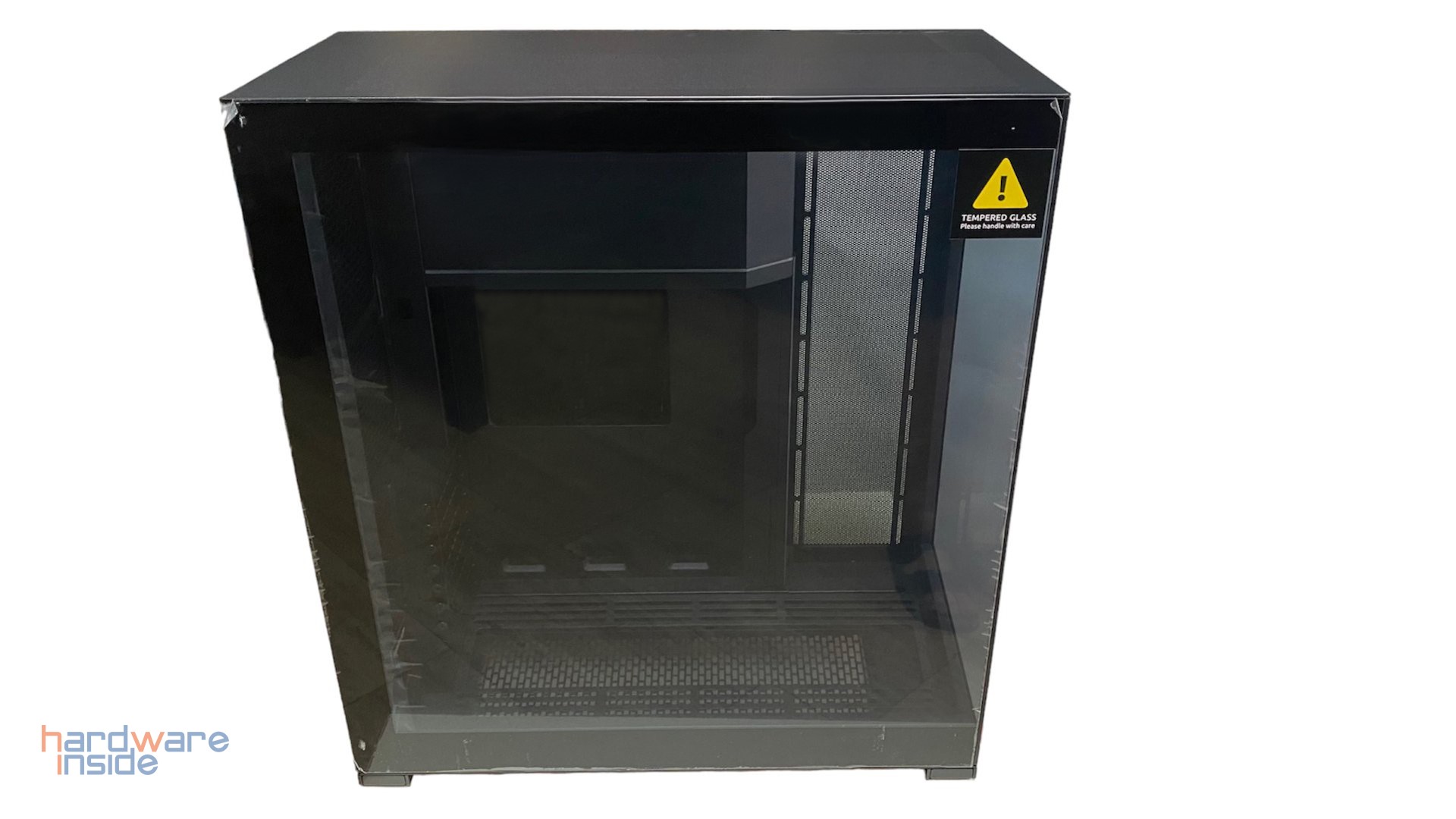 Mit den Maßen 532 x 253 x 586 mm (L x B x H) und den großen Glasflächen an der Front und der linken Seite wirkt das NV7 imposant. Die Glasteile bestehen aus leicht getöntem Tempered Glas und sind an den Außenkanten mit einem breiten schwarzen Streifen versehen. Dabei fällt auch direkt auf, dass die linke Seite keine Verbindungstrebe besitzt und so einen direkten Blick auf den Innenraum ermöglicht. Ein zusätzlicher Blickfang ist die unten abgeschrägte Front, die gleichzeitig auch den Standfuß bildet.