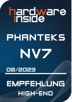 PHANTEKS hat mit dem NV7 ein großes Showgehäuse auf dem Markt gebracht, das neben einer eher schlichten edlen Optik auch hervorragend verarbeitet ist. Durch die flexible Kühllösung kann sowohl eine Luft- wie auch eine Wasserkühlung installiert werden. Sehr gelungen ist auch das Design, welches die Hardware in den Vordergrund stellt und einen Großteil der Verkabelung innen wie außen verdeckt. Das wahlweise an der Vorder- oder Rückseite einsetzbare I/O-Panel ist mit modernen Anschlüssen ausgestattet. Abgerundet wird alles mit einer flexiblen D-RGB-Steuerung samt dem integrierten Controller, die wahlweise am Gehäuse oder über das Mainboard zwei Kanäle zur Steuerung der Beleuchtungsgruppen bietet. Etwas Schade finden wir das PHANTEKS hier JST-Anschlüsse nutzt. Auch hätten wir uns gewünscht, dass nicht nur der Boden, sondern auch der Deckel und die Rückseite mit einem separaten Staubfilter ausgestattet wäre. Das NV7 ist zum Testzeitpunkt für 219,90€ gelistet. Trotz einiger kleinerer Schwächen verdient sich das PHANTEKS NV7 unseren High-End Award.