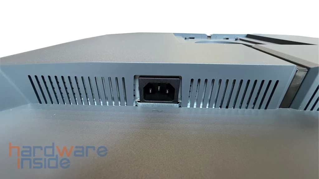 Ergänzt wird das Anschlussfeld durch drei USB-A-Ports mit mindestens USB-3.0-Standard. Allerdings erfolgt die Anbindung des Hubs über einen klassischen USB-B-Upstream-Port, dessen Bandbreite im Vergleich zu modernen USB-C-Lösungen eingeschränkt ist. Ein USB-C-Port mit Display- und Datenübertragung zum PC hätte hier eine deutlich zeitgemäßere und flexiblere Lösung dargestellt – insbesondere, um die USB-A-Ports als vollwertigen Hub komfortabel nutzen zu können. Ein Audio-Ausgang für Headsets oder externe Lautsprecher ist ebenfalls vorhanden. Das Netzteil ist intern verbaut, sodass lediglich ein Kaltgerätekabel angeschlossen werden muss, was das Kabelmanagement vereinfacht und für ein aufgeräumteres Gesamtbild sorgt.