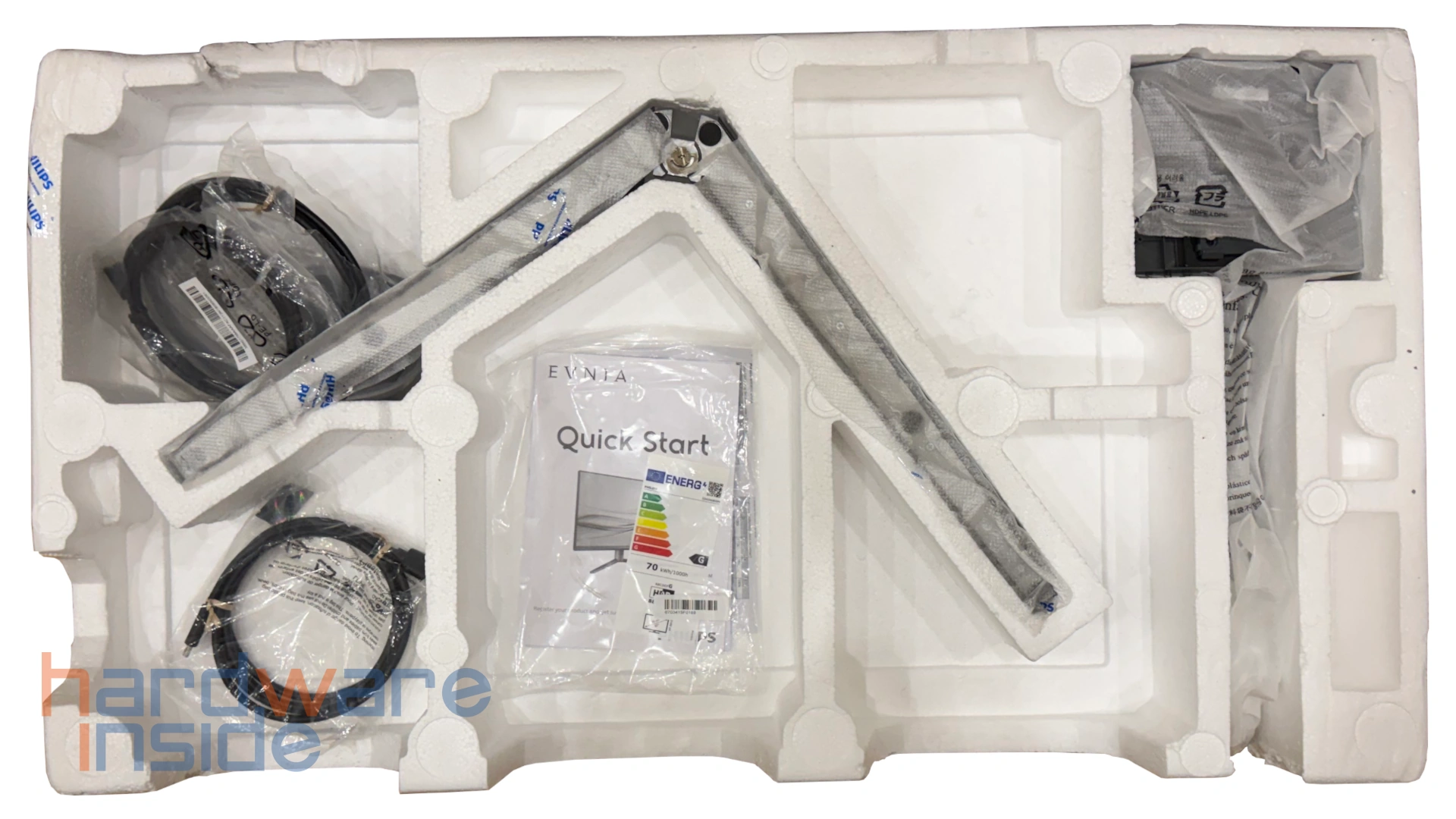 Im Inneren ist der Philips Evnia 32M2N6800M/00 sorgfältig verpackt und durch passgenaue Schutzelemente zuverlässig gesichert. Der Lieferumfang ist übersichtlich gehalten und deckt die wichtigsten Anschluss- und Einsatzmöglichkeiten im Alltag ab. Neben dem Monitor selbst legt Philips in der Regel ein DisplayPort-Kabel, ein HDMI-Kabel sowie ein Netzkabel bei, sodass einer schnellen Inbetriebnahme nichts im Weg steht.