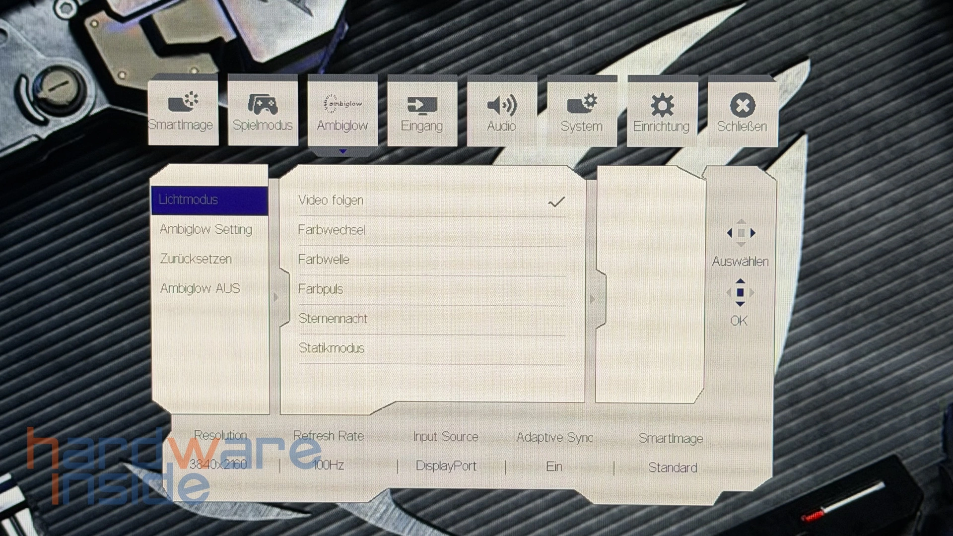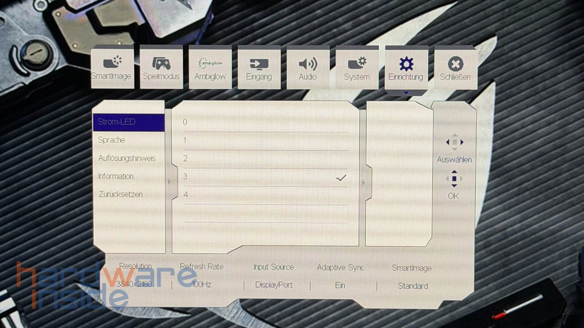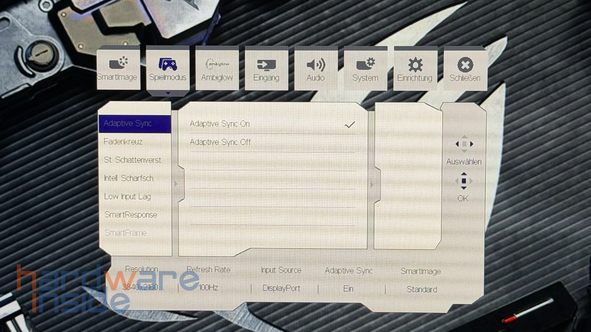 Das OSD ist übersichtlich aufgebaut und bietet eine breite Auswahl an Konfigurationsmöglichkeiten. Neben klassischen Bildparametern wie Helligkeit, Kontrast und Farbtemperatur stehen auch gamingspezifische Optionen zur Verfügung. Dazu gehören unter anderem verschiedene Bildmodi, Adaptive-Sync-Einstellungen sowie Funktionen zur Optimierung der Darstellung in schnellen Spielsituationen.