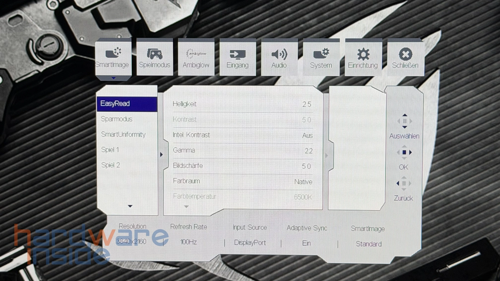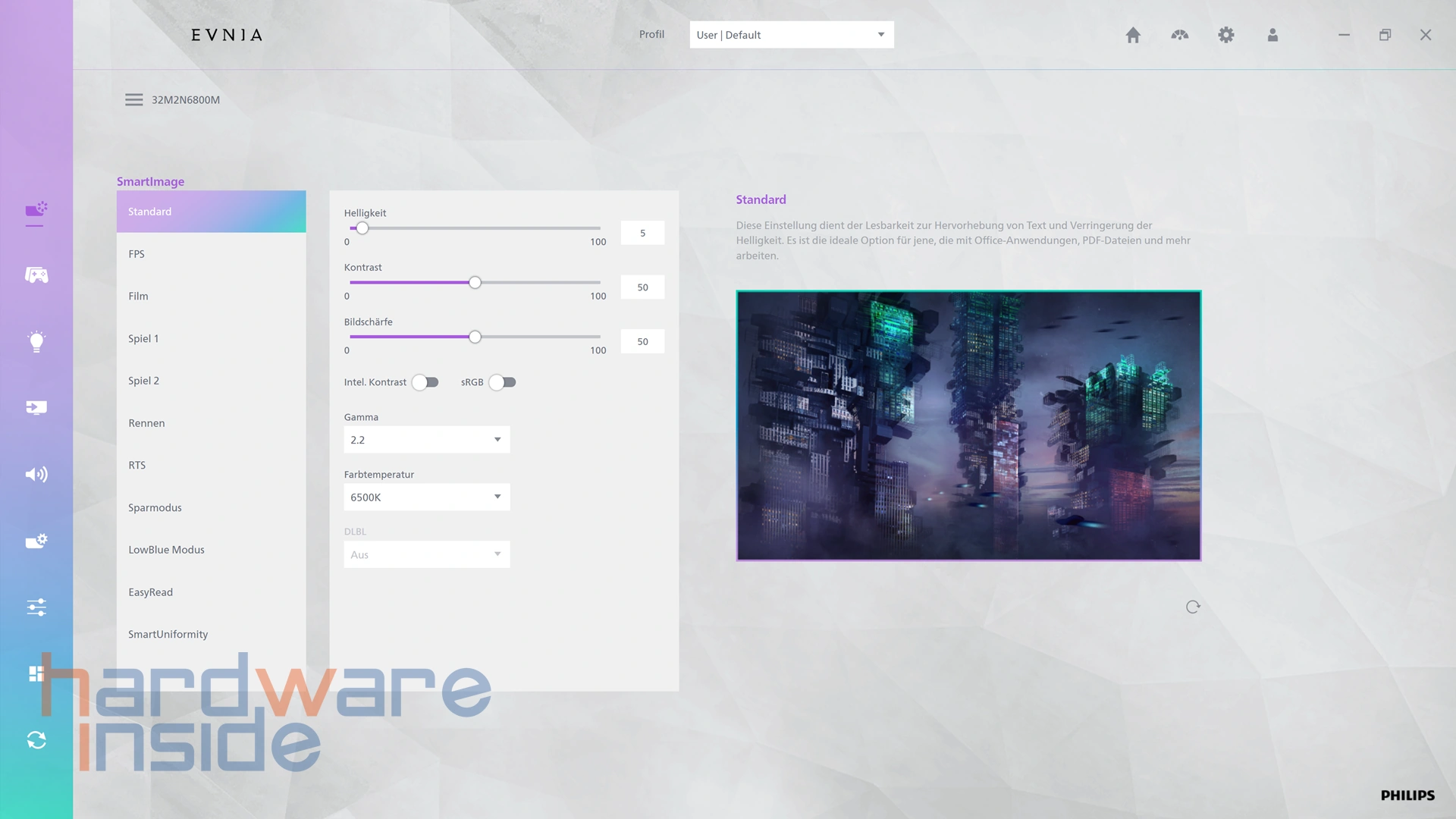 Zusätzlich lässt sich der Monitor über die passende Philips-Software unter Windows steuern. Dadurch können viele OSD-Einstellungen bequem per Maus und Tastatur vorgenommen werden, ohne direkt auf die rückseitigen Bedienelemente zugreifen zu müssen. Insgesamt wirkt die Bedienung durchdacht und benutzerfreundlich, sodass sowohl erfahrene Gamer als auch Einsteiger schnell die gewünschten Einstellungen finden.