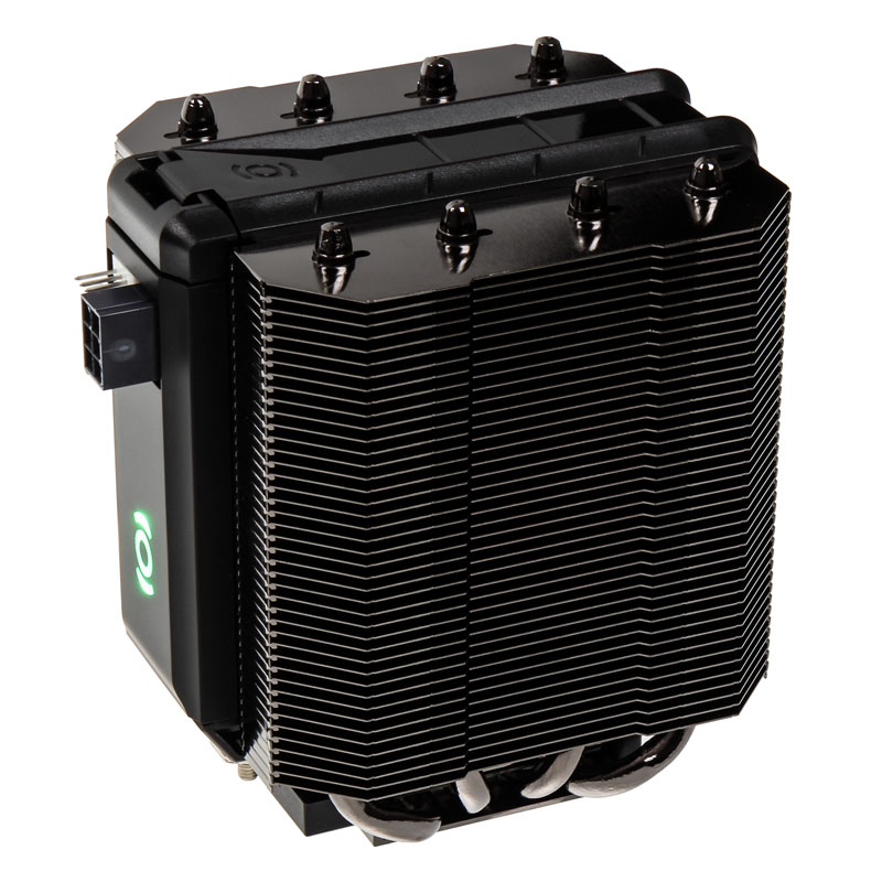 Der Dual-Tower-Kühler verfügt über acht Kupferheatpipes (vier pro Seite) mit je sechs Millimetern Durchmesser, eine spiegelglatte Kupferbodenplatte sowie zwei Aluminium-Lamellenkühlkörper. Zwischen Letzteren versteckt sich unter einer „Fan-Shroud“ getauften Abdeckung ein austauschbarer 92-Millimeter-Lüfter. Eine edle Nickelbeschichtung auf allen Metalloberflächen lässt den optisch dezent auftretenden CPU-Kühler schwarz glänzen und wird durch ein trendiges LED-Logo auf der mattschwarzen Lüfterabdeckung bereichert.