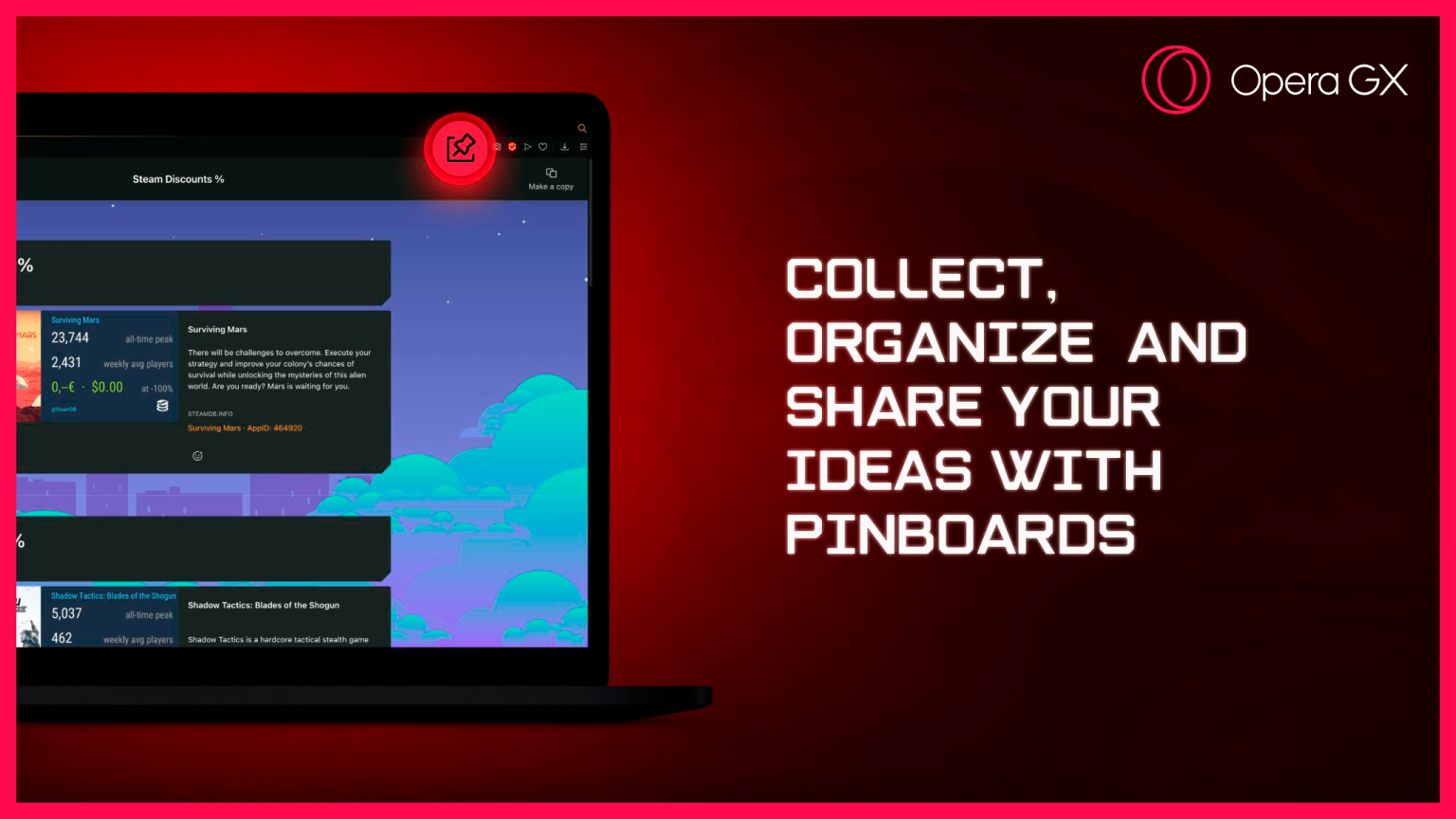 Mit Opera GX behalten Spieler immer den Überblick. Pinnwände sind eine bestehende Funktion des Gaming-Browsers Opera GX, mit denen man stets den Überblick über sein wachsendes Web-„Inventar“ behält. Dabei helfen Pinnwände, gespeicherte Links und Videos in einer organisierten, formschönen und ansprechenden Weise zu verwalten. Opera GX-Benutzer können nützliche Sammlungen erstellen, wichtige Links einfach verwalten und bei Bedarf mit anderen teilen.