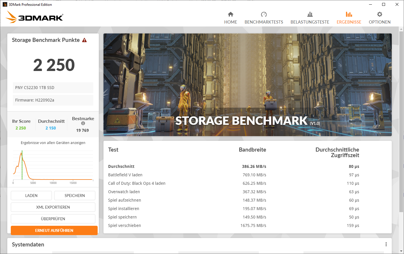 Als nächstes lassen wir die PNY SSD in einem Speicher-Benchmark der 3DMark-Suite antreten. Im Gegensatz zu anderen synthetischen Benchmarks versucht dieser Test einige realitätsnahe Szenarien nachzustellen, um eine Einschätzung der Performance in Spielen zu erhalten. Die Leistung des PNY CS2230 wird als leicht überdurchschnittlich eingestuft. Im Durchschnitt erreichen wir über die verschiedenen Szenarien eine Bandbreite von 386,26 MB/s, während die durchschnittliche Zugriffszeit bei 80 µs liegt.