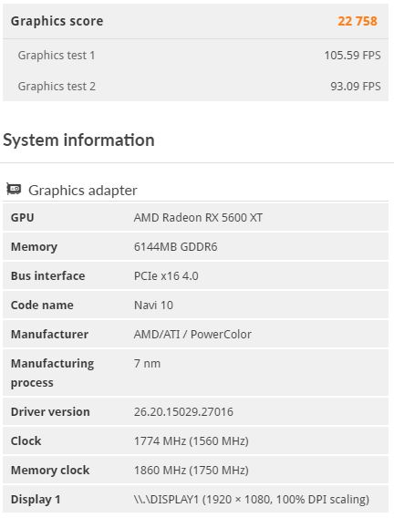 Im Fire Strike erreicht die PowerColor Red Dragon RX5600X einen Grphic Score von 22.758 Punkten. Daraus resultieren 105,59 FPS im ersten Graphics Test und 93,09 FPS im zweiten Graphics Test. Die Red Dragon schafft im Physics Score 16.096 Punkte bei einem FPS-Wert von 51,10 FPS. Auch anhand dieses Benchmarks lassen sich Temperaturen ablesen, die die 75°C nicht übersteigen, sondern sogar eher bei 68°C angesiedelt sind.