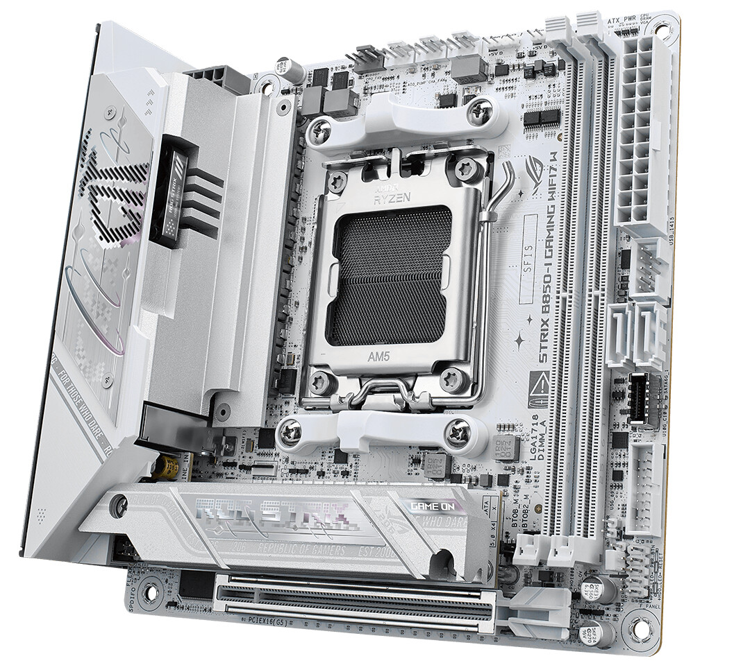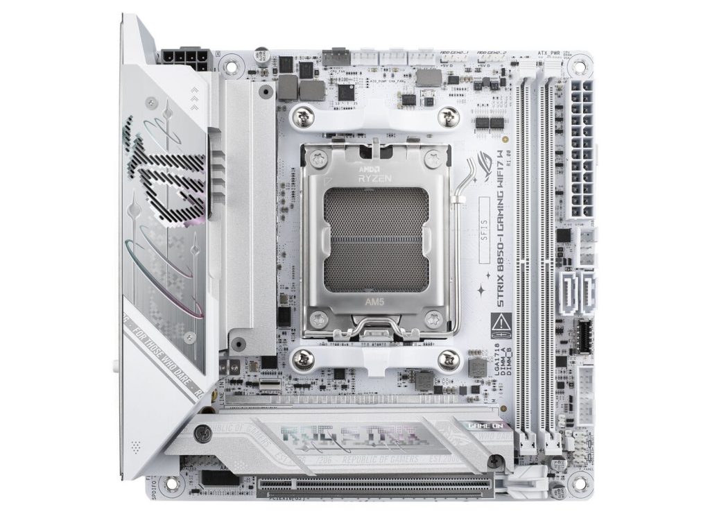 Im vergangenen Monat startete ASUS eine Teaser-Kampagne, die auf ein völlig neues Design eines ROG-Mini-Mainboards hindeutete. Das Werbematerial zeigte lediglich eine stark verpixelte Vorschau eines hellen Mini-ITX-Produkts. Anfang dieser Woche tauchte schließlich ein einzelnes Renderbild auf – die Bildqualität war gut genug, um die unveröffentlichte SKU als weiße Variante des bereits erschienenen Strix B850-I Gaming WiFi7-Boards zu identifizieren. Vor wenigen Tagen wurde auf dem zentralen ASUS-Webauftritt eine eigene Produktseite für das „W“-Modell veröffentlicht. Wir gehen davon aus, dass als nächstes offizielles Pressematerial folgt – es sei denn, die Verantwortlichen halten die dezente optische Überarbeitung dieses Modells für nicht erwähnenswert. Ärgerlich ist lediglich, dass das detaillierte Webportal der White Edition keinen klaren Blick auf die Rückseite des Boards gewährt.
