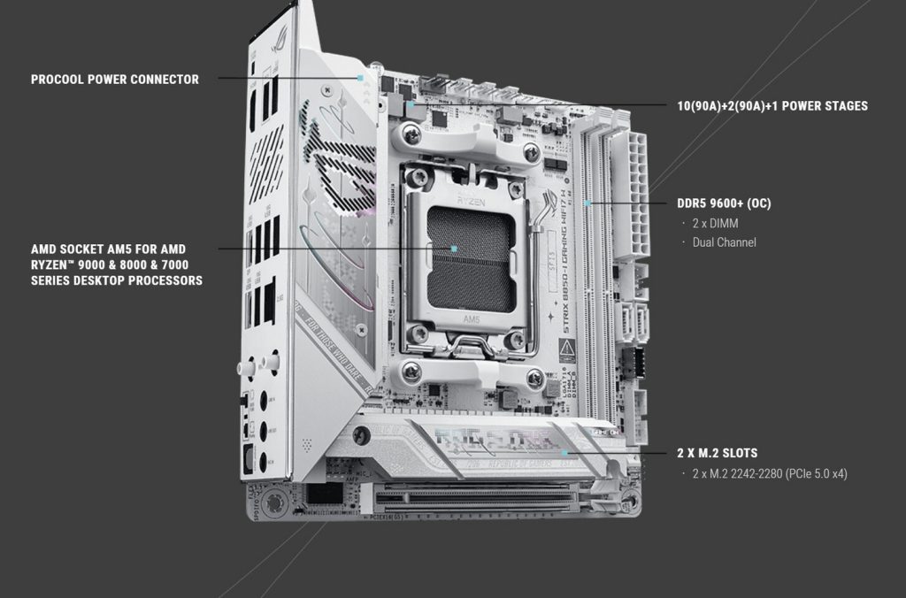 Wenig überraschend hat der taiwanische Hersteller die exakte Beschreibung und Spezifikationen der schwarzen Standardvariante übernommen: Das „(neueste Modell) integriert modernste Technologie in einem eleganten Mini-ITX-Formfaktor. Es verfügt über PCIe-5.0-Slots für Grafik und Speicher, Dual-Channel-DDR5-Slots sowie eine robuste Stromversorgung für erstklassiges Gaming und anspruchsvolle Workloads. Fortschrittliche Kühllösungen sorgen für konstante Spitzenleistung, während Wi-Fi 7 ultraschnelle Konnektivität gewährleistet. Diese Plattform bietet die Power und Anschlussvielfalt, die moderne KI-PC-Anwendungen erfordern.“ Ein wesentlicher Unterschied – zumindest digital festgehalten – ist der Einsatz eines „64-MB-BIOS“ in der White Edition. Der größere ASUS-BIOS-Chip wird als Grundlage für eine „leistungsstärkere Benutzeroberfläche“ und „Unterstützung zukünftiger AM5-Prozessoren“ beworben.