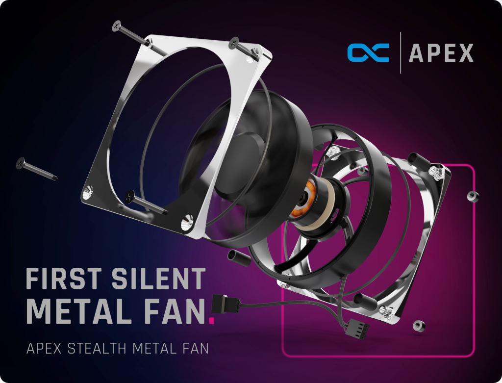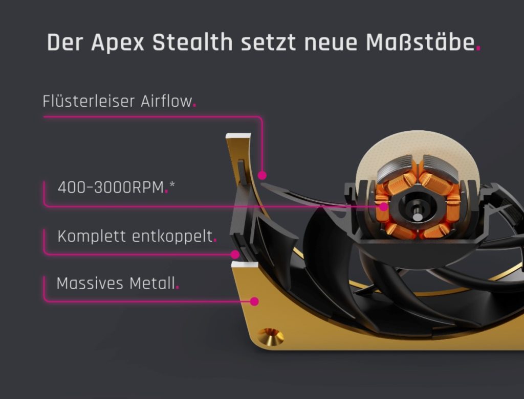 06.10.2023 . Leistung, die man nicht hört! Alphacool präsentiert mit dem neuen Apex Stealth Metall Lüfter einen leistungsstarken und extrem leisen Lüfter, der zu beeindrucken weiß. Hochwertig, elegantes sowie zeitloses Design und technische Innovation – dafür steht der Apex Stealth. Mit der zum Patent angemeldeten Entkopplungstechnologie, dem robusten Metallrahmen und einem speziellen Rotor bleibt er bei jeder Drehzahl der leiseste am Markt.