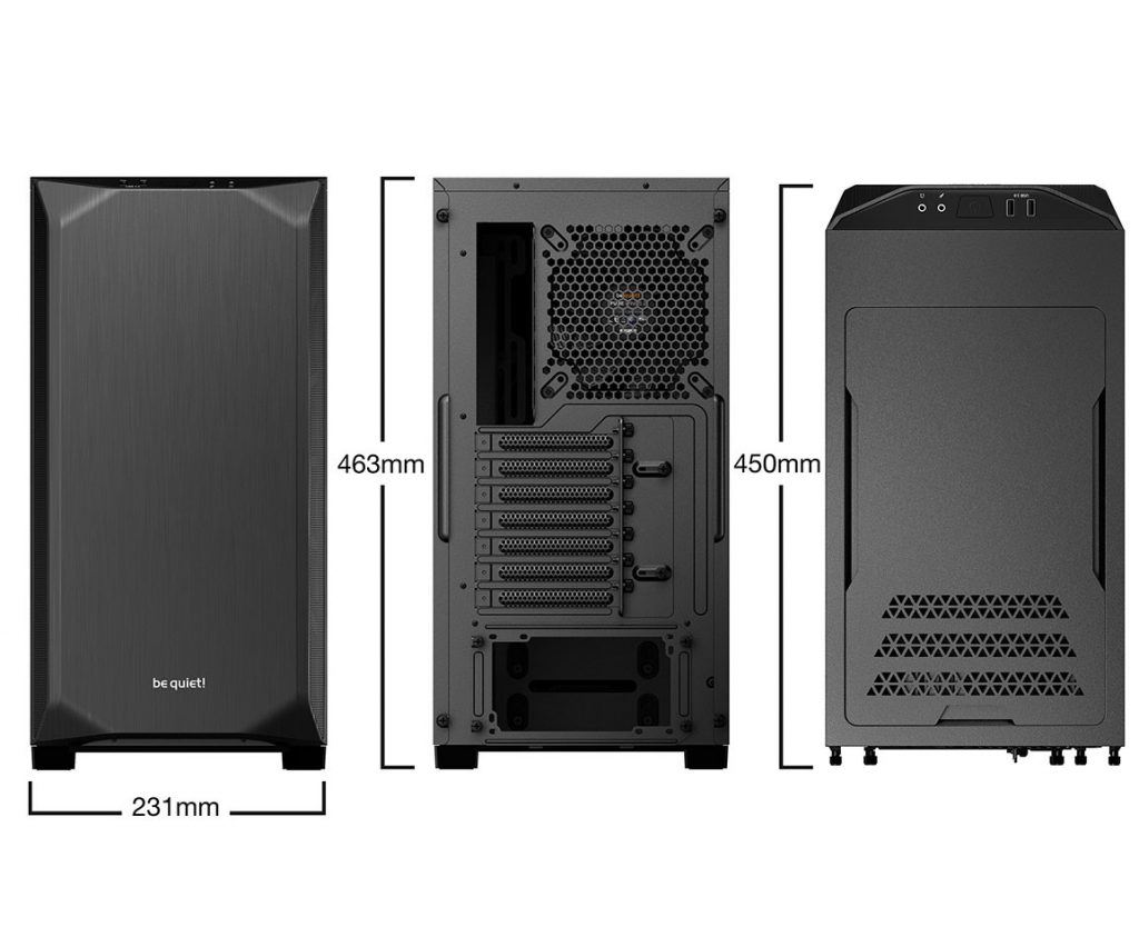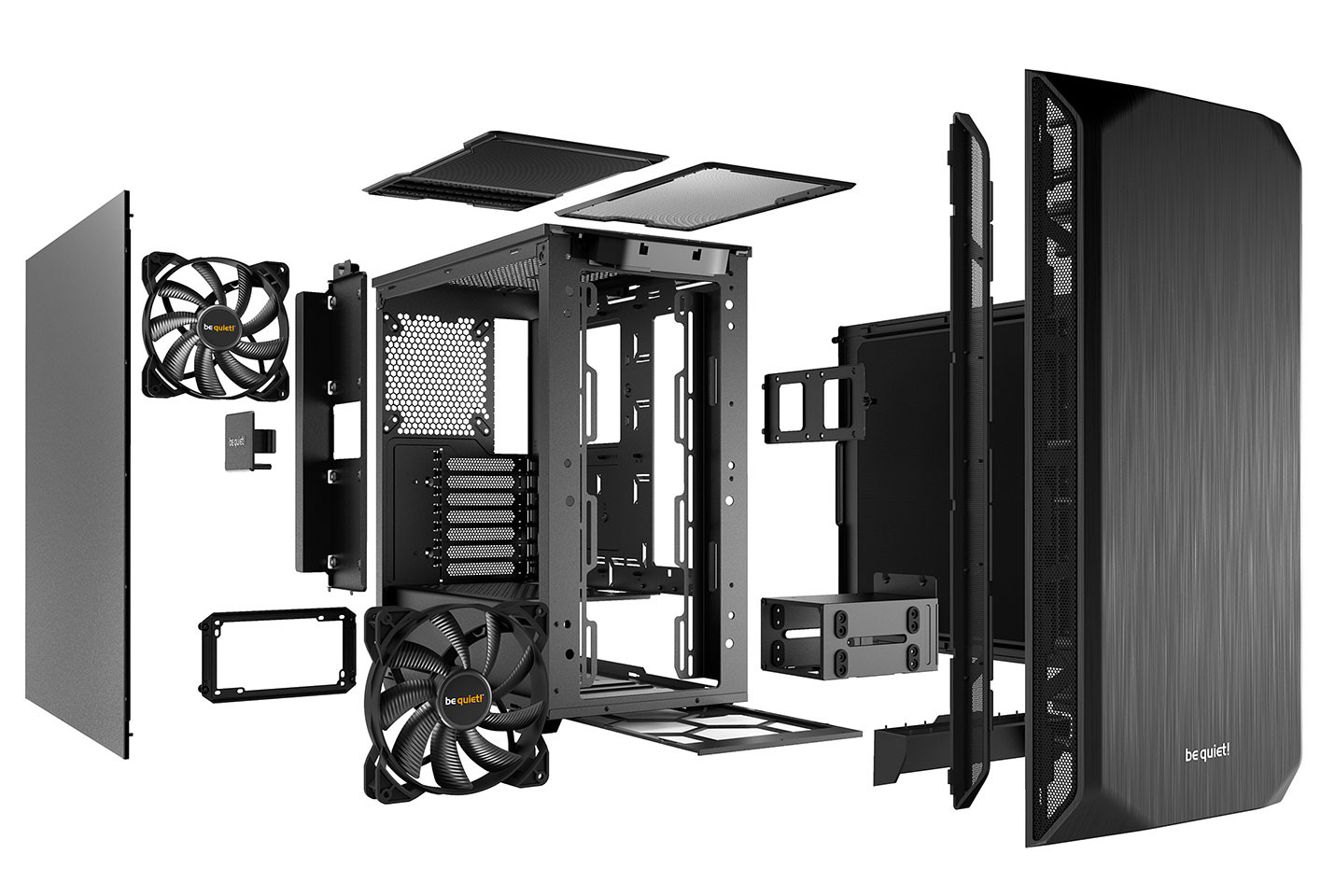 Um einen geräuscharmen Betrieb zu gewährleisten, sind die Innenseiten des Frontpaneels, der geschlossenen Seitenwände und des standardmäßig installierten Top-Covers mit schallisolierendem Material verkleidet. Das einfache Kabelmanagement wird durch die Netzteilabdeckung, zahlreiche Ösen auf der Rückseite des Mainboard-Trays und mitgelieferte Klettbänder ermöglicht. Die SSD-Halterung dient zudem als Durchführung für Kabel von der Rückseite des Gehäuses zum Mainboard oder der Grafikkarte und kann entfernt werden, um den Installationsvorgang zu erleichtern. Mithilfe eines abnehmbaren Rahmens wird das Netzteil von der Rückseite des Gehäuses eingesetzt. Am Boden des Gehäuses reicht der Staubfilter über die gesamte Länge und lässt sich von vorne herausziehen, ohne den PC zu zerlegen. Die Lufteinlässe an der linken und rechten Vorderseite sowie der Griff zum Entnehmen der Front sind ebenfalls mit Staubfiltern geschützt. Je nach Modell wird das Pure Base 500 mit schallisolierter Seitenwand oder Seitenteil aus Temperglas und in einer der drei Varianten Black, Metallic Gray und White angeboten. Bei den Versionen in Metallic Gray und White ist das Temperglas-Fenster klar, während das Glas beim schwarzen Pure Base 500 leicht getönt ist.