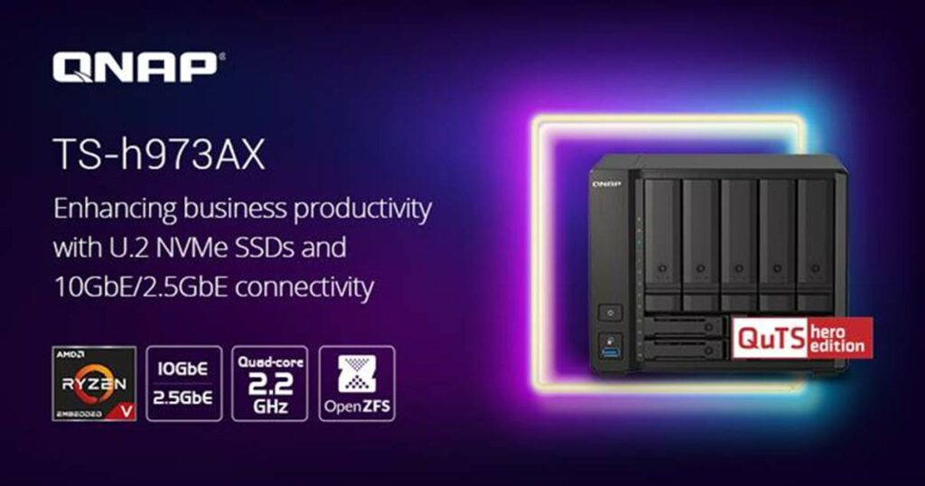 Willich/Deutschland, Taipeh/Taiwan, 21. Dezember 2020 – QNAP® Systems, Inc., ein führender Innovator von Computer-, Netzwerk- und Speicherlösungen, hat heute das TS-h973AX QuTS hero NAS vorgestellt, das mit einem AMD Ryzen™ V1000 Serie V1500B Quad-Core 2,2 GHz Prozessor und 10GbE/2,5GbE Konnektivität ausgestattet ist. Es verfügt über vier 2,5-Zoll SSD Steckplätze – wobei zwei Steckplätze sowohl leistungsfähige 32Gbps U.2 NVMe PCIe Gen 3 x4 SSDs als auch günstige SATA 6Gb/s SSDs für latenzempfindliche Anwendungen unterstützen. Mit dem zuverlässigen ZFS-basierten QuTS hero Betriebssystem bietet das TS-h973AX geschäftskritische Funktionen und ermöglicht eine Kapazität von bis zu einem Petabyte pro gemeinsam genutztem Ordner, wodurch eine leistungsstarke und dennoch kostengünstige NAS Lösung entsteht.