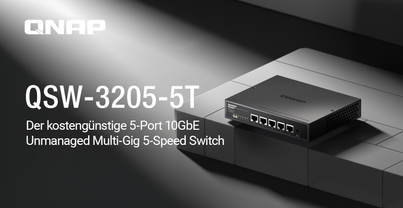 QNAP hat heute mit dem QSW-3205-5T einen Full 10GbE unmanaged Switch der Einstiegsklasse vorgestellt. Mit einem kompakten Desktop Formfaktor und einer ultraleisen Kühlung verfügt der QSW-3205-5T über fünf 10GbE RJ45 Ports und automatische Funktionen zur Netzwerkoptimierung wie Jumbo Frame und Schleifenerkennung. Der QSW-3205-5T ermöglicht Anwendern in kleinen Unternehmen, Videoproduktionsteams oder Privathaushalten eine reibungslose High-Speed Datenübertragung, schnelle Dateifreigabe sowie die Zusammenarbeit und Bearbeitung von 4K/8K Videodateien durch mehrere Benutzer.